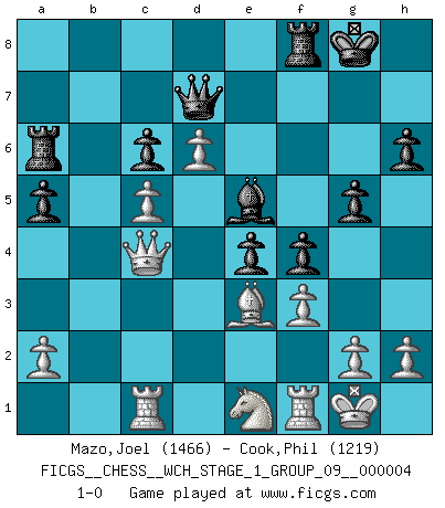 Last move : 1-0 2008 March 16 11:12:30 [Event "FICGS__CHESS__WCH_STAGE_1_GROUP_09__000004"] [Site "FICGS"] [Date "2008.01.08"] [Round "1"] [White "Mazo,Joel"] [Black "Cook,Phil"] [Result "1-0"] [WhiteElo "1466"] [BlackElo "1219"] 1.e4 Nf6 2.e5 Nd5 3.c4 Nb6 4.c5 Nd5 5.Nc3 Nxc3 6.dxc3 e6 7.b4 d5 8.cxd6 cxd6 9.Nf3 Be7 10.Bf4 Nc6 11.exd6 Bf6 12.Rc1 O-O 13.b5 e5 14.bxc6 bxc6 15.Be3 Qd7 16.Qd2 a5 17.Be2 Ba6 18.Bxa6 Rxa6 19.O-O h6 20.c4 e4 21.Ne1 g5 22.c5 Be5 23.f3 f5 24.Qc2 f4 25.Qc4+ 1-0 Alekhine's defense : Two pawns' (Lasker's) attack Kingside Castling by player Black (move 12) Kingside Castling by player White (move 19) Player White won this chess game. Follow this game move after move (download)There just isn't enough televised Chess. (David Letterman) Ein guter Spieler hat immer Glück. (José Raúl Capablanca) El Ajedrez es la vida. (Bobby Fischer) Les écrivains ont utilisé les échecs pour analyser les côtés extrêmes de la nature humaine. Dans ce cadre, les échecs offrent un champ d'expérimentation idéal. Mais on pourrait faire la même chose avec la peinture. Et là, en vous référant à Van Gogh, vous ne tirerez pas de conclusion définitive sur les peintres. (Gary Kasparov) Life is like a play: it's not the length but the excellence of the acting that matters. (Seneca)