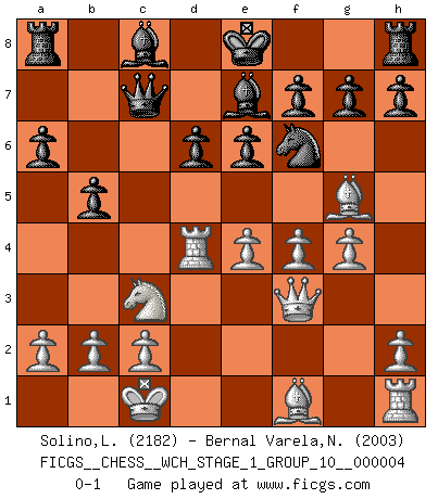 Last move : 0-1 2008 March 7 15:26:11 [Event "FICGS__CHESS__WCH_STAGE_1_GROUP_10__000004"] [Site "FICGS"] [Date "2008.01.08"] [Round "1"] [White "Solino,Leonardo"] [Black "Bernal Varela,Nelson"] [Result "0-1"] [WhiteElo "2182"] [BlackElo "2003"] 1.e4 c5 2.Nf3 d6 3.d4 cxd4 4.Nxd4 Nf6 5.Nc3 a6 6.Bg5 e6 7.f4 Be7 8.Qf3 Qc7 9.O-O-O Nc6 10.g4 Nxd4 11.Rxd4 b5 0-1 This chess game has been lost on time (started : 2008.01.08 19:55:15) Sicilian : Najdorf, 7...Be7 Queenside Castling by player White (move 9) Player Black won this chess game. Follow this game move after move (download)A bad plan is better than none at all. (Frank Marshall) Fischer machte Schach einfach zu einer aufregenden Sache, wann immer er sich ans Brett setzte. (Raymond Keene) Uno no tiene que jugar muy bien, es suficiente jugar mejor que el oponente. (Siegbert Tarrasch) Les Echecs sont affaire de jugement sensible. Savoir quand frapper et quand esquiver. (Fischer) You think that education is too expensive ? Try ignorance. (Derek Bok)