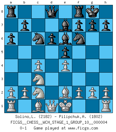 Last move : 0-1 2008 February 25 14:38:16 [Event "FICGS__CHESS__WCH_STAGE_1_GROUP_10__000004"] [Site "FICGS"] [Date "2008.01.08"] [Round "1"] [White "Solino,Leonardo"] [Black "Pilipchuk,Andrey"] [Result "0-1"] [WhiteElo "2182"] [BlackElo "1802"] 1.e4 c5 2.Nf3 Nc6 3.d4 cxd4 4.Nxd4 e5 5.Nb5 d6 6.c4 Be7 7.N1c3 a6 8.Na3 Nf6 9.Be2 Be6 10.Nc2 O-O 0-1 This chess game has been lost on time (started : 2008.01.08 19:55:15) Sicilian : Labourdonnais-Loewenthal (Kalashnikov) variation Kingside Castling by player Black (move 10) Player Black won this chess game. Follow this game move after move (download)The Pin is mightier than the sword. (Fred Reinfeld) Wer wird heute Abend ihr Gegner sein? -- Heute Abend spiele ich gegen die schwarzen Steine. (Akiba Rubinstein) Tu puedes aprender mucho mas de una partida que pierdas que de una partida ganada. Tendras que perder cientos de partidas antes de llegar a ser un buen jugador. (Jose Raul Capablanca) Le pion, dans sa simplicité, marche droit devant lui, mais lorsqu'il prend, il le fait obliquement? Ainsi l'homme, tant qu'il reste pauvre, marche dans la droiture et vit honnêtement, mais lorsqu'il recherche les honneurs, il flatte, se parjure et, par les voies obliques, cherche une position supérieure sur l'échiquier du monde. (Jean de Galles) The Internet is so big, so powerful and pointless that for some people it is a complete substitute for life. (Andrew Brown)
