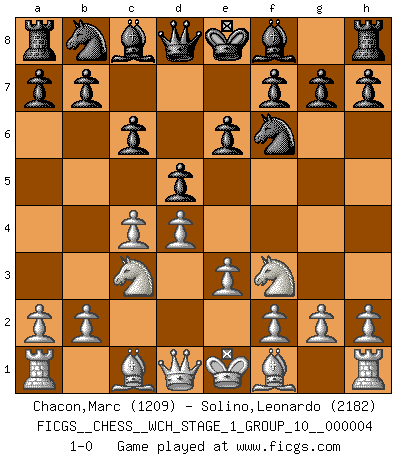 Last move : 1-0 2008 February 19 1:48:51 [Event "FICGS__CHESS__WCH_STAGE_1_GROUP_10__000004"] [Site "FICGS"] [Date "2008.01.08"] [Round "1"] [White "Chacon,Marc"] [Black "Solino,Leonardo"] [Result "1-0"] [WhiteElo "1209"] [BlackElo "2182"] 1.d4 d5 2.c4 c6 3.Nf3 Nf6 4.e3 e6 5.Nc3 1-0 This chess game has been lost on time (started : 2008.01.08 19:55:15) QGD Slav : 4.e3 Player White won this chess game. Follow this game move after move (download)Fischer is the strongest player in the world. In fact, the strongest player who ever lived. (Larry Evans) Schach ist Leben. (Robert James Fischer) ¿Porque tengo que perder ante este idiota?. (Aron Nimzovich) Je fais ceci parce que dans cinquante coups j'obtiendrai cela; je m'appelle Mikhail Moisevitch Botvinnik. (Botvinnik) Programming can only do so much before it becomes too much. (Don Groves)