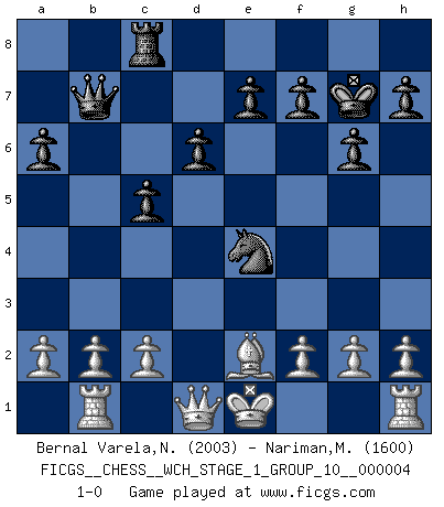 Last move : 1-0 2008 March 26 5:5:45 [Event "FICGS__CHESS__WCH_STAGE_1_GROUP_10__000004"] [Site "FICGS"] [Date "2008.01.08"] [Round "1"] [White "Bernal Varela,Nelson"] [Black "Nariman,Meisam"] [Result "1-0"] [WhiteElo "2003"] [BlackElo "1600"] 1.e4 c5 2.Nf3 d6 3.d4 cxd4 4.Nxd4 Nc6 5.Nc3 a6 6.Be3 Nf6 7.Be2 g6 8.Nd5 Bg7 9.Nxc6 bxc6 10.Bb6 Qd7 11.Nc7+ Kf8 12.Nxa8 Nxe4 13.Bd4 Qb7 14.Nb6 c5 15.Bxg7+ Kxg7 16.Nxc8 Rxc8 17.Rb1 1-0 This chess game has been lost on time (started : 2008.01.08 19:55:15) Sicilian Player White won this chess game. Follow this game move after move (download)Chess is like war on a board. (Bobby Fischer) Ich hatte Angst gegen einen russischen Großmeister zu verlieren, und er befürchtete gegen einen kleinen Jungen zu verlieren. (über ein Remis gegen Juri Awerbach). (Robert James Fischer) Puntos débiles o agujeros en la posición de tu oponente deben de ser ocupados por piezas, no Peones. (Siegbert Tarrasch) Si le désir cupide (et stupide) de gagner est une inépuisable source de souffrance, une combinaison brillante sur l'échiquier est une découverte : le coquelicot qui s'épanouit lorsque apparaît la Voie Lactée. (Arrabal) Employ the attack like tactic of defense. (Chinese proverb)