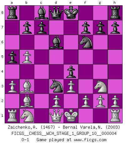 Last move : 0-1 2008 February 13 7:49:11 [Event "FICGS__CHESS__WCH_STAGE_1_GROUP_10__000004"] [Site "FICGS"] [Date "2008.01.08"] [Round "1"] [White "Zaichenko,Andrey"] [Black "Bernal Varela,Nelson"] [Result "0-1"] [WhiteElo "1467"] [BlackElo "2003"] 1.b4 e5 2.a3 d5 3.Bb2 Nd7 4.e3 Ngf6 5.c4 a5 6.b5 dxc4 7.Bxc4 e4 8.Ne2 Bd6 9.Ng3 Ne5 10.Bb3 Nd3+ 0-1 Polish (Sokolsky) opening Player Black won this chess game. Follow this game move after move (download)It is peculiar but a fact nevertheless, that gamblers in chess always have enthusiastic followers. (Botvinnik) Ich habe kein Problem mit Frauen, sondern nur mit dem Niveau ihres Schachspiels (Judith Polgar) En el tablero, la mentira e hipocresía no sobreviven mucho. (Emanuel Lasker) Shah mat. Le roi est mort. Cri de fierté d'un joueur venant de terrasser son adversaire, courtoisement, sans effusion de sang. I find television to be very educating. Every time somebody turns on the set, I go in the other room and read a book. (Groucho Marx)