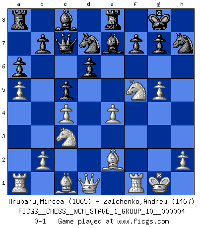 Last move : 0-1 2008 March 20 16:13:34 [Event "FICGS__CHESS__WCH_STAGE_1_GROUP_10__000004"] [Site "FICGS"] [Date "2008.01.08"] [Round "1"] [White "Hrubaru,Mircea"] [Black "Zaichenko,Andrey"] [Result "0-1"] [WhiteElo "1865"] [BlackElo "1467"] 1.e4 e5 2.Nf3 d6 3.d4 exd4 4.Nxd4 Nf6 5.f3 Be7 6.c4 O-O 7.Nc3 Nbd7 8.Be2 Ne5 9.f4 Ned7 10.O-O c5 11.Nf5 Nb6 12.Ne3 Qc7 13.a4 a6 14.a5 Nbd7 15.g4 h6 16.Nf5 Re8 17.g5 hxg5 18.fxg5 Nh7 0-1 Philidor : Exchange variation Kingside Castling by player Black (move 6) Kingside Castling by player White (move 10) Player Black won this chess game. Follow this game move after move (download)For me, Chess is life and every game is like a new life. Every Chess player gets to live many lives in one lifetime. (Eduard Gufeld) Das Blackmar-Diemer-Gambit verändert den ganzen Menschen! (Emil Joseph Diemer) Realmente no sabemos como el juego fue inventado, aunque hay sospechas. Tan pronto como descubramos a los culpables, se los haremos saber. (Bruce Pandolfini) Des points faibles ou des trous dans la position de l'adversaire doivent être occupés par des pièces et non pas par des pions. (Siegbert Tarrasch) Work expands to fill the time available. (C. Northcote Parkinson, in Parkinson's Laws)
