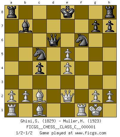 Last move : 1/2-1/2 2006 June 16 10:5:26 [Event "FICGS__CHESS__CLASS_C__000001"] [Site "FICGS"] [Date "2006.04.13"] [Round "1"] [White "Ghisi,Stefano"] [Black "Muller,Henri-Louis"] [Result "1/2-1/2"] [WhiteElo "1829"] [BlackElo "1923"] 1.d4 Nf6 2.c4 e6 3.Nf3 d5 4.e3 c6 5.Nc3 Nbd7 6.Bd3 dxc4 7.Bxc4 b5 8.Bd3 Bb7 9.O-O a6 10.e4 c5 11.d5 c4 12.Bc2 Qc7 13.dxe6 fxe6 14.Nd4 Nc5 15.Qe2 Bd6 16.f4 e5 17.Ndxb5 axb5 18.Nxb5 Qb6 19.Nxd6+ Qxd6 20.fxe5 1/2-1/2 Queen's pawn game Kingside Castling by player White (move 9) This chess game ended in a draw. Follow this game move after move (download)Chess is a fairy tale of 1001 blunders. (Savielly Tartakower) Wenn Du einsam bist, wenn Du Dich in der Welt wie ein Fremder fühlst, spiele Schach. Das wird Deinen Geist erheben und Dein Ratgeber im Kampf sein. (Aristoteles) El Ajedrez es tan interesante por sí solo, que no es necesario un interés monetario para persuadir a una persona a que lo practique; por lo tanto, nunca se juega por dinero. (Benjamin Franklin) On peut tirer plus d'utilité d'une partie perdue que de 100 parties gagnées. (Capablanca) Man is still the most extraordinary computer of all. (John F. Kennedy)