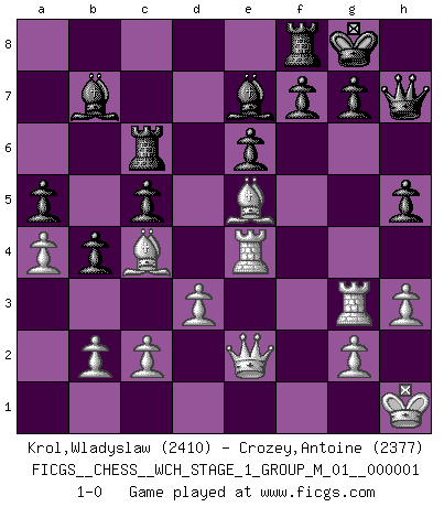 Last move : 1-0 2006 November 2 8:35:55 [Event "FICGS__CHESS__WCH_STAGE_1_GROUP_M_01__000001"] [Site "FICGS"] [Date "2006.07.01"] [Round "1"] [White "Krol,Wladyslaw"] [Black "Crozey,Antoine"] [Result "1-0"] [WhiteElo "2410"] [BlackElo "2377"] 1.e4 c6 2.f4 d5 3.Nf3 dxe4 4.Ng5 Nf6 5.Bc4 e6 6.Nc3 b5 7.Bb3 a5 8.a4 Nbd7 9.Ncxe4 h6 10.Nxf6+ Qxf6 11.Nf3 Qxf4 12.Qe2 b4 13.O-O Ba6 14.d3 Qg4 15.h3 Bc5+ 16.Kh1 Qg3 17.Nh2 Qg6 18.Bf4 O-O 19.Nf3 Rfe8 20.Rae1 Be7 21.Ne5 Nxe5 22.Bxe5 c5 23.Rf4 h5 24.Ref1 Rf8 25.R1f3 Bb7 26.Re3 Ra6 27.Bc4 Rc6 28.Rfe4 Qh7 29.Rg3 1-0 This chess game has been lost on time (started : 2006.07.01 16:27:27) Caro-Kann defense Kingside Castling by player White (move 13) Kingside Castling by player Black (move 18) Player White won this chess game. Follow this game move after move (download)Chess is above all, a fight ! (Emanuel Lasker) Ich erzeugte keinen Neid, da mich die Schachspieler als Musiker und die Musiker als Schachspieler betrachteten. (Mark Taimanov) A la fecha, Fischer esta simplemente un nivel arriba de todos los mejores jugadores de Ajedrez del mundo. (John Jacobs) Les Echecs ont trois composantes : le temps, l'espace et le matériel en dernier. (Mikhail Tal) The only sure thing about luck is that it will change. (Wilson Mizner)