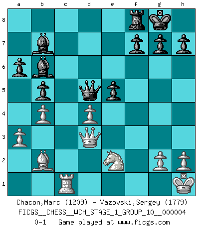 Last move : 0-1 2008 April 9 7:16:53 [Event "FICGS__CHESS__WCH_STAGE_1_GROUP_10__000004"] [Site "FICGS"] [Date "2008.01.08"] [Round "1"] [White "Chacon,Marc"] [Black "Vazovski,Sergey"] [Result "0-1"] [WhiteElo "1209"] [BlackElo "1779"] 1.d4 d5 2.c4 dxc4 3.e3 Nf6 4.Bxc4 c5 5.Ne2 e6 6.O-O a6 7.Nbc3 Nc6 8.b3 cxd4 9.Nxd4 Nxd4 10.exd4 b5 11.Bd3 Bb7 12.Re1 Bb4 13.Bb2 O-O 14.a3 Ba5 15.b4 Bb6 16.Ne2 Ng4 17.Nf4 Nxf2 18.Qe2 Nxd3 19.Qxd3 Qd6 20.Ne2 Rac8 21.Rec1 e5 22.Kh1 Rxc1+ 23.Rxc1 Qd5 0-1 This chess game has been lost on time (started : 2008.01.08 19:55:15) Queen's gambit accepted Kingside Castling by player White (move 6) Kingside Castling by player Black (move 13) Player Black won this chess game. Follow this game move after move (download)Live, lose, and learn, by observing your opponent how to win. (Amber Steenbock) Modernes Schach erfordert enorme Anspannung. Es ist für einen normalen Menschen unmöglich das auszuhalten. (Viktor Kortschnoi) Con el tiempo, empecé a progresar en partidas decisivas. Tal vez porque me di cuenta de una simple verdad: no solo estaba yo nervioso sino también mi oponente. (Mikhail Tal) On a dit que l'homme se distingue de l'animal par le fait qu'il achète plus de livres qu'il ne peut en lire. Je voudrais suggérer qu'inclure à la liste des livres quelques livres d'échecs rendrait la distinction manifeste. (Edward Lasker) A clear conscience is usually the sign of a bad memory. (Unknown)