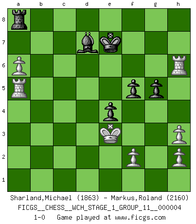 Last move : 1-0 2008 March 26 7:33:25 [Event "FICGS__CHESS__WCH_STAGE_1_GROUP_11__000004"] [Site "FICGS"] [Date "2008.01.08"] [Round "1"] [White "Sharland,Michael"] [Black "Markus,Roland"] [Result "1-0"] [WhiteElo "1863"] [BlackElo "2160"] 1.e4 c6 2.d4 d5 3.exd5 cxd5 4.c4 Nf6 5.Nc3 e6 6.c5 Be7 7.Nf3 O-O 8.b4 Ne4 9.Bb2 f5 10.Be2 Bf6 11.O-O b6 12.Rc1 bxc5 13.dxc5 a6 14.Nd4 Bxd4 15.Qxd4 Nc6 16.Qd1 Nxb4 17.Nxe4 dxe4 18.Qb3 Nd5 19.Bc4 Rf7 20.c6 a5 21.Rfd1 a4 22.Qc3 h6 23.Qe5 Qc7 24.Bxd5 Qxe5 25.Bxe5 exd5 26.Rxd5 Be6 27.Rd2 Rc8 28.c7 Re7 29.Bd6 Rd7 30.a3 Kf7 31.Rc6 g5 32.Rd4 h5 33.Kf1 h4 34.Rxa4 Bd5 35.Rb6 Ke6 36.Bf4 Kf7 37.Be5 Be6 38.Bd6 Rxd6 39.Rxd6 Rxc7 40.Rb4 Ra7 41.a4 Ke7 42.Rdb6 Ra5 43.R6b5 Ra6 44.a5 Ra8 45.Ke2 Ra6 46.Kd2 Ra8 47.Rb7+ Kf6 48.Ra4 Bc8 49.Rb6+ Ke7 50.a6 Bd7 51.Ra5 Kd8 52.Rh6 Ke7 53.Ke3 h3 54.gxh3 1-0 Caro-Kann : Panov-Botvinnik attack, 5...e6 Kingside Castling by player Black (move 7) Kingside Castling by player White (move 11) Player White won this chess game. Follow this game move after move (download)Chess is no whit inferior to the violin, and we have a large number of professional violinists. (Mikhail Botvinnik) Wenn Du einsam bist, wenn Du Dich in der Welt wie ein Fremder fühlst, spiele Schach. Das wird Deinen Geist erheben und Dein Ratgeber im Kampf sein. (Aristoteles) La enorme capacidad mental, en la que sin ella no puede un jugador de Ajedrez existir, es demasiado requerida por el Ajedrez al grado de que nunca podrá liberar su mente de este juego. (Albert Einstein) La conception d'un plan est le processus par lequel un joueur exploite les avantages de sa position tout en s'efforçant d'en réduire au minimum les inconvénients. Afin de garantir le succès, un plan doit toujours se fonder sur un diagnostic objectif des particularités d'une position. La conception d'un plan est d'autant plus difficile que la position est équilibrée, et grandement facilitée lorsqu'il n'existe qu'un seul plan susceptible de répondre aux exigences de la position. (Harry Golombek) Creativity is inventing, experimenting, growing, taking risks, breaking rules, making mistakes, and having fun. (Mary Lou Cook)