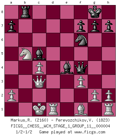Last move : 1/2-1/2 2008 January 28 8:2:52 [Event "FICGS__CHESS__WCH_STAGE_1_GROUP_11__000004"] [Site "FICGS"] [Date "2008.01.08"] [Round "1"] [White "Markus,Roland"] [Black "Perevozchikov,Vjacheslav"] [Result "1/2-1/2"] [WhiteElo "2160"] [BlackElo "1823"] 1.e4 e5 2.Nf3 d6 3.d4 exd4 4.Nxd4 Nf6 5.Nc3 Be7 6.Bf4 O-O 7.Qd2 c6 8.O-O-O b5 9.f3 b4 10.Nce2 c5 11.Nb3 c4 12.Nbd4 d5 13.Bxb8 Rxb8 14.Nc6 Qc7 15.Nxb8 Qxb8 16.exd5 c3 17.bxc3 bxc3 18.Qxc3 Bb7 19.d6 Bxd6 20.Qb3 Bc5 21.c4 Qc7 22.Nd4 Rb8 23.Qc3 Be4 24.Nb5 Qf4+ 1/2-1/2 Philidor : Exchange variation Kingside Castling by player Black (move 6) Queenside Castling by player White (move 8) This chess game ended in a draw. Follow this game move after move (download)I like to say that Bobby Fischer was the greatest player ever. But what made Fischer a genius was his ability to blend an American freshness and pragmatism with Russian ideas about strategy. (Bruce Pandolfini) Das typische an einem Großmeister ist, daß er eine gewonnene Position schnell und schmerzlos gewinnt. (Irving Chernev) Alekhine es un poeta que crea un trabajo de arte de algo que raramente inspiraría a otra persona a mandar una tarjeta postal. (Max Euwe) Que feriez-vous si vous étiez en train de jouer aux échecs et que la fin du monde arrive ? Je continuerais à jouer. (Saint Borromée) SEO proverb : Make your website optimized for human beings, not for search engines.