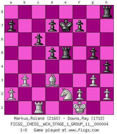 Last move : 1-0 2008 March 6 3:53:12 [Event "FICGS__CHESS__WCH_STAGE_1_GROUP_11__000004"] [Site "FICGS"] [Date "2008.01.08"] [Round "1"] [White "Markus,Roland"] [Black "Downs,Ray"] [Result "1-0"] [WhiteElo "2160"] [BlackElo "1713"] 1.e4 e5 2.Nf3 Nc6 3.d4 exd4 4.Nxd4 Nf6 5.Nxc6 bxc6 6.e5 Qe7 7.Qe2 Nd5 8.c4 Ba6 9.b3 O-O-O 10.g3 g5 11.Bg2 Bg7 12.Bb2 Rde8 13.O-O Bxe5 14.Qxe5 Qxe5 15.Bxe5 Rxe5 16.cxd5 Bxf1 17.Kxf1 cxd5 18.Nc3 c6 19.Rc1 Kd8 20.Bf3 h5 21.Be2 Ke7 22.Bd3 h4 23.Ne2 1-0 Scotch : Mieses variation Queenside Castling by player Black (move 9) Kingside Castling by player White (move 13) Player White won this chess game. Follow this game move after move (download)When I have White, I win because I am white; When I have Black, I win because I am Bogolyubov. (Bogolyubov) Die Auseinandersetzung mit Karpow war politisch geprägt. Er stand für das kommunistische System, wurde von dessen Repräsentanten gehätschelt. Ich war der Oppositionelle. Jeder Schachweltmeister spiegelt auch die gesellschaftlichen Verhältnisse wider. Kramnik steht für die Börsen-Generation des Neuen Markts, ideologiefrei, zahlenfixiert. (Garry Kasparov) No puedes jugar al Ajedrez si eres de corazón noble. (Proverbio Francés) Un journaliste : 'Vous préférez avoir une dame de plus sur l'échiquier ou au lit ?' Boris Spassky : 'Ca dépend de la position.' Drag your thoughts away from your troubles... by the ears, by the heels, or any other way you can manage it. (Mark Twain)