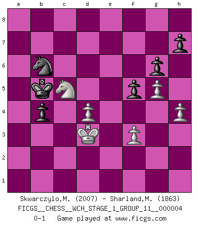 Last move : 0-1 2008 April 5 17:43:17 [Event "FICGS__CHESS__WCH_STAGE_1_GROUP_11__000004"] [Site "FICGS"] [Date "2008.01.08"] [Round "1"] [White "Skwarczylo,Marek"] [Black "Sharland,Michael"] [Result "0-1"] [WhiteElo "2007"] [BlackElo "1863"] 1.d4 Nf6 2.Nf3 d5 3.c4 e6 4.Nc3 c6 5.e3 Nbd7 6.cxd5 exd5 7.Bd3 Bd6 8.O-O O-O 9.Qc2 Re8 10.Re1 Nb6 11.e4 dxe4 12.Nxe4 Nxe4 13.Rxe4 Rxe4 14.Bxe4 g6 15.Bg5 Qc7 16.Re1 Bd7 17.h3 Re8 18.Bf6 Be6 19.a3 Bd5 20.Be5 Re6 21.Bxd5 Nxd5 22.Qb3 Re7 23.Qc4 Qd8 24.b4 a6 25.Kf1 Re6 26.Bxd6 Rxe1+ 27.Nxe1 Qxd6 28.Qe2 a5 29.bxa5 Qxa3 30.Qe8+ Kg7 31.Qe5+ f6 32.Qe8 Qxa5 33.Qd7+ Kh6 34.Qxb7 Qb5+ 35.Qxb5 cxb5 36.g3 Kg7 37.Nd3 Kf7 38.Ke2 Ke6 39.Kd2 Kd6 40.h4 f5 41.f3 Kd7 42.Ne5+ Ke6 43.Nd3 Kd6 44.Nc1 b4 45.Kd3 Nb6 46.g4 Kc6 47.Nb3 Kb5 48.Nc5 Nd5 49.g5 Nb6 0-1 Queen's pawn game Kingside Castling by player White (move 8) Kingside Castling by player Black (move 8) Player Black won this chess game. Follow this game move after move (download)In Chess, just as in life, today's bliss may be tomorrow's poison. (Assaic) Der Bart als Geschlechtszeichen mitten im Gesicht ist obszön. Daher gefällt er den Weibern. [Zugegeben, kein Schachzitat, aber unglaublich originell] (Arthur Schopenhauer) El juego de Damas es para vagabundos. (Paul Morphy) Même un GMI sait rarement calculer sur plus de cinq coups une attaque à sacrifices. (Rudolf Spielmann) Heh, heh, heh. Time to abandon ship. (General Grievous in Star Wars ep.3)
