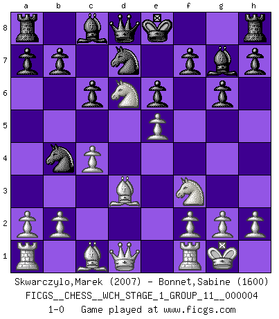 Last move : 1-0 2008 February 26 14:38:32 [Event "FICGS__CHESS__WCH_STAGE_1_GROUP_11__000004"] [Site "FICGS"] [Date "2008.01.08"] [Round "1"] [White "Skwarczylo,Marek"] [Black "Bonnet,Sabine"] [Result "1-0"] [WhiteElo "2007"] [BlackElo "1600"] 1.d4 g6 2.e4 Bg7 3.Nc3 d6 4.Nf3 c6 5.Bd3 e6 6.O-O Nf6 7.e5 dxe5 8.dxe5 Nd5 9.Ne4 Nd7 10.c4 Nb4 11.Nd6+ 1-0 This chess game has been lost on time (started : 2008.01.08 19:56:34) Modern defense Kingside Castling by player White (move 6) Player White won this chess game. Follow this game move after move (download)If your opponent offers you a draw, try to work out why he thinks he's worse off. (Nigel Short) Das Zentrum ist der Balkan des Schachbretts - Kriegshandlungen können in jedem Moment ausbrechen. (Aaron Nimzowitsch) Me siento como si fuera una pieza en una partida de Ajedrez, cuando mi oponente me indica: esa pieza no puede ser movida. (Soren Kierkegaard) Nous sommes les pions de la mystérieuse partie d'Echecs jouée par Dieu. Il nous déplace, nous arrête, nous pousse encore, puis nous lance un à un dans la boîte du Néant. Epitaphe sur la tombe de David Janowsky (1868-1927). I know the human being and fish can coexist peacefully. (George W. Bush, Saginaw sept. 29, 2000)