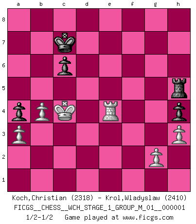 Last move : 1/2-1/2 2006 November 3 20:23:43 [Event "FICGS__CHESS__WCH_STAGE_1_GROUP_M_01__000001"] [Site "FICGS"] [Date "2006.07.01"] [Round "1"] [White "Koch,Christian"] [Black "Krol,Wladyslaw"] [Result "1/2-1/2"] [WhiteElo "2318"] [BlackElo "2410"] 1.e4 e5 2.Nf3 Nc6 3.Bb5 a6 4.Ba4 Nf6 5.O-O Bc5 6.c3 Ng4 7.d4 Ba7 8.h3 h5 9.Na3 Qf6 10.Nc2 Qg6 11.Re1 f6 12.a3 Ne7 13.Nh4 Qh7 14.Nf5 Nxf5 15.exf5 Qxf5 16.Qe2 c6 17.Ne3 Nxe3 18.Bxe3 d5 19.dxe5 Bxe3 20.Qxe3 fxe5 21.Qxe5+ Qxe5 22.Rxe5+ Kf7 23.Rae1 Kf6 24.Re7 Rb8 25.Bc2 h4 26.f4 Bf5 27.Bxf5 Kxf5 28.Rf7+ Kg6 29.R1e7 Rhg8 30.Kf2 Rbf8 31.f5+ Kg5 32.Rxb7 a5 33.Rxf8 Rxf8 34.Rxg7+ Kxf5 35.Rg4 Ke5 36.Ke3 Rh8 37.b4 a4 38.Rg6 Rc8 39.Kd3 Rf8 40.Ke2 Rc8 41.Rg4 Rh8 42.Kd3 Kd6 43.Kd4 Rh6 44.c4 dxc4 45.Kxc4 Rh5 46.Rd4+ Kc7 47.Re4 1/2-1/2 Ruy Lopez : Moeller defense Kingside Castling by player White (move 5) This chess game ended in a draw. Follow this game move after move (download)Chess books should be used as we use glasses: to assist the sight, although some players make use of them as if they thought they conferred sight. (Jose Raul Capablanca) Wenn sie aufgeben, dann danke ich Ihnen für das Spiel (Eventualzug beim Fernschach). (Anonymous) La pasion por jugar al Ajedrez es una de las mas inexplicables en el mundo. (H.G. Wells) 'L'échange des dames est un coup dur pour les deux adversaires...' Un journaliste lors d'une partie du match Spassky-Fischer Programming can only do so much before it becomes too much. (Don Groves)