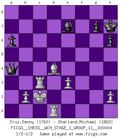 Last move : 1/2-1/2 2008 April 28 20:17:53 [Event "FICGS__CHESS__WCH_STAGE_1_GROUP_11__000004"] [Site "FICGS"] [Date "2008.01.08"] [Round "1"] [White "Cruz,Danny"] [Black "Sharland,Michael"] [Result "1/2-1/2"] [WhiteElo "1760"] [BlackElo "1863"] 1.d4 Nf6 2.c4 e6 3.Nf3 d5 4.Nc3 Be7 5.Bg5 h6 6.Bh4 O-O 7.e3 b6 8.Be2 Bb7 9.Rc1 dxc4 10.Bxc4 Nbd7 11.O-O a6 12.a4 c5 13.Qe2 cxd4 14.Nxd4 Nc5 15.Rfd1 Qe8 16.Bg3 Nfe4 17.Nxe4 Nxe4 18.Bc7 Qxa4 19.Bxb6 Rac8 20.Nxe6 Nxf2 21.Qxf2 fxe6 22.Bxe6+ Kh8 23.Qg3 Rc2 24.Bh3 Bh4 25.Qd6 Rxg2+ 26.Bxg2 Bf2+ 27.Kf1 Bxg2+ 28.Kxg2 Qe4+ 29.Kf1 Rf5 30.Ke2 Bh4 31.Kd2 Rd5+ 32.Qxd5 Qxd5+ 33.Bd4 Kh7 34.Rc7 Qa5+ 35.Rc3 Be7 36.Kc1 Qa1+ 37.Kc2 Qa4+ 38.Kc1 Qa1+ 39.Kc2 Qa4+ 1/2-1/2 Queen's pawn game Kingside Castling by player Black (move 6) Kingside Castling by player White (move 11) This chess game ended in a draw. Follow this game move after move (download)Only sissies Castle. (Rob Sillars) Deine Wertungszahl - vorausgesetzt einige Jahre schachliche Anstrengung - entspricht etwa dem zehnfachen Deines IQ plus 1000. (Jonathan Levitt) Siempre es mucho mejor sacrificar las piezas de tu oponente. (Savielly Tartakover) C'est une question de caractère, Beaucoup de gens perdent leur motivation très vite. D'autres, ils sont rares, peuvent la conserver très longtemps. J'aime les échecs, encore aujourd'hui je suis heureux d'analyser des parties. J'aime toujours gagner, je déteste encore perdre. Bien jouer est important pour mon intégrité intellectuelle et morale. Et puis les échecs vivent en ce moment une période historique grâce à Internet. Ils se développent dans les systèmes éducatifs à travers le monde. Ils sortent de leur ghetto, et c'est mon rôle de mener à bien cette révolution. (Gary Kasparov) When the going gets tactical, the computers get going. (Hyatt)