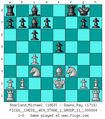 Last move : 1-0 2008 March 6 3:53:59 [Event "FICGS__CHESS__WCH_STAGE_1_GROUP_11__000004"] [Site "FICGS"] [Date "2008.01.08"] [Round "1"] [White "Sharland,Michael"] [Black "Downs,Ray"] [Result "1-0"] [WhiteElo "1863"] [BlackElo "1713"] 1.e4 e5 2.Bc4 Nc6 3.f4 Nf6 4.Nf3 Bc5 5.fxe5 Nxe4 6.d4 Nxd4 7.Bd5 O-O 8.Nxd4 c6 9.Bxe4 Qh4+ 10.Kf1 Qxe4 11.Nf3 f6 12.Qe2 Qxe2+ 13.Kxe2 fxe5 14.Be3 Bd6 15.c4 Bc7 16.Nc3 1-0 Bishop's Opening Kingside Castling by player Black (move 7) Player White won this chess game. Follow this game move after move (download)Fischer is under obligation to nobody. (Joseph Platz) Ein bischen Romantik kann weder im Schach noch in der Liebe schaden. Also versuche ich mich ab und zu daran zu erinnern. (Nigel Short) No es una movida, aún la mejor movida que tu debas buscar, sino un plan comprensible. (Eugene Znosko-Borovsky) Si je n'étais pas joueur d'échecs, je serais le meilleur dans quelque chose d'autre. (Anatoli Karpov) May the force be with you. (Han Solo in Star Wars ep.4)