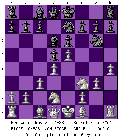 Last move : 1-0 2008 February 20 13:52:33 [Event "FICGS__CHESS__WCH_STAGE_1_GROUP_11__000004"] [Site "FICGS"] [Date "2008.01.08"] [Round "1"] [White "Perevozchikov,Vjacheslav"] [Black "Bonnet,Sabine"] [Result "1-0"] [WhiteElo "1823"] [BlackElo "1600"] 1.e4 e6 2.d4 d5 3.Nd2 Nc6 4.Ngf3 Nge7 5.c3 Ng6 6.g3 Bd6 7.e5 Nce7 8.h4 1-0 This chess game has been lost on time (started : 2008.01.08 19:56:34) French : Tarrasch, Guimard variation Player White won this chess game. Follow this game move after move (download)I play correspondence chess because it is both art and science while chess is art only. (A player at FICGS) Die meiste Zeit treffe ich auf Gegner, die meine Enkel sein könnten. Ich bin da, um ihnen zu zeigen, dass sie von mir noch einiges lernen können. (Viktor Kortschnoi) El Ajedrez es una hermosa aventura. (Bent Larsen) Les échecs c'est le défi de l'alpiniste, toujours plus haut, prêt à tout pour monter à l'assaut du Roi ennemi. Les échecs, c'est de la musique en mouvement, un ballet majestueux pour les yeux. C'est de la poésie composée par les fantômes du passé qui au même titre que Rimbaud ou Verlaine méritent notre admiration. Les échecs, c'est de la peinture ou le moindre mouvement modifie le tableau pour en faire un Picasso ou un Van Gogh. Les échecs, c'est tout et rien, c'est la vie et la mort. Jjulie33 sur le forum de France-Echecs. Optimism is a variety of information deficit. Sometimes especially true for correspondence chess games. (Michael Aigner)