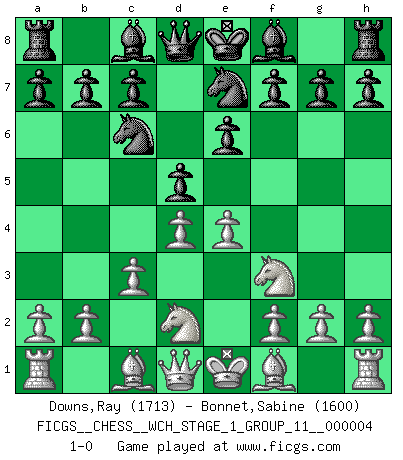 Last move : 1-0 2008 February 26 2:38:28 [Event "FICGS__CHESS__WCH_STAGE_1_GROUP_11__000004"] [Site "FICGS"] [Date "2008.01.08"] [Round "1"] [White "Downs,Ray"] [Black "Bonnet,Sabine"] [Result "1-0"] [WhiteElo "1713"] [BlackElo "1600"] 1.e4 e6 2.d4 d5 3.Nd2 Nc6 4.Ngf3 Nge7 5.c3 1-0 This chess game has been lost on time (started : 2008.01.08 19:56:34) French : Tarrasch, Guimard variation Player White won this chess game. Follow this game move after move (download)When you don't know what to do, wait for your opponent to get an idea - it's sure to be wrong. (Tarrasch) Bobby Fischer ist kein Vorbild für die heutige Jugend. (Viktor Kortschnoi) Fischer no está bajo la obligación de nadie. (Joseph Platz) Un millionnaire : 'Monsieur Steinitz ! Vous ne participez aux tournois que pour l'argent, alors que moi je n'y viens que pour l'honneur.' Steinitz : 'Chacun joue pour ce qu'il n'a pas'... Sometimes it pays to stay in bed in Monday, rather than spending the rest of the week debugging Monday's code. (Dan Salomon)