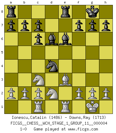 Last move : 1-0 2008 March 11 2:47:16 [Event "FICGS__CHESS__WCH_STAGE_1_GROUP_11__000004"] [Site "FICGS"] [Date "2008.01.08"] [Round "1"] [White "Ionescu,Catalin"] [Black "Downs,Ray"] [Result "1-0"] [WhiteElo "1486"] [BlackElo "1713"] 1.e4 e5 2.Nf3 Nc6 3.Bb5 Nf6 4.O-O Nxe4 5.Re1 Nd6 6.Bxc6 dxc6 7.Nxe5 Be7 8.d4 O-O 9.Nc3 Nf5 10.Be3 Be6 11.Qd2 Re8 12.Bf4 Qxd4 13.Nf3 Qxd2 14.Nxd2 Nd4 15.Rac1 Bd6 16.Be3 1-0 Ruy Lopez : Berlin defense, Open variation Kingside Castling by player White (move 4) Kingside Castling by player Black (move 8) Player White won this chess game. Follow this game move after move (download)If you aren't afraid of Spassky, then I have removed the element of money. (Jim Slater) Wenn ich gewinne bin ich ein Genie. Wenn nicht, dann bin ich keines. (Robert James Fischer) Por tratar de evitar la pérdida de una pieza, muchas personas han perdido una partida de Ajedrez. (Savielly Tartakover) On croit qu'il y a plus de mauvais joueurs que de bons joueurs, c'est faux : Il y a autant de joueurs qui gagnent que de joueurs qui perdent. (Philippe Geluck) O divine art of subtlety and secrecy! Through you we learn to be invisible, through you inaudible and hence we can hold the enemy's fate in our hands. (Sun Tzu)