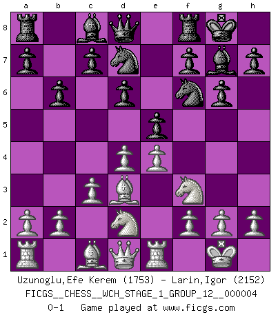 Last move : 0-1 2008 February 23 2:20:24 [Event "FICGS__CHESS__WCH_STAGE_1_GROUP_12__000004"] [Site "FICGS"] [Date "2008.01.08"] [Round "1"] [White "Uzunoglu,Efe Kerem"] [Black "Larin,Igor"] [Result "0-1"] [WhiteElo "1753"] [BlackElo "2152"] 1.d4 g6 2.Nf3 Bg7 3.e4 d6 4.Bd3 Nd7 5.O-O e5 6.c3 Ngf6 7.Nbd2 O-O 8.Re1 b6 0-1 This chess game has been lost on time (started : 2008.01.08 19:57:51) Modern defense Kingside Castling by player White (move 5) Kingside Castling by player Black (move 7) Player Black won this chess game. Follow this game move after move (download)I am the best player in the world and I am here to prove it. (Bobby Fischer) Obendrein hat der FIDE-Präsident den Revolutionsführer Gaddafi zum »Großmeister« ernannt, am Ende der WM. Das ist lächerlich! (Joel Lautier) La belleza de un movimiento no se refleja solo en su apariencia, sino en el pensamiento detrás de él. (Siegbert Tarrasch) Une platitude souvent récitée à propos des Echecs est qu'une des choses les plus difficiles à réaliser est de gagner une position gagnante. Cela ne manque pas de sens mais, pour ma part, j'ai toujours trouvé plus difficile de gagner une position perdante. (Tim Krabbe) Now be brave and don't look back. Don't look back. (Shmi Skywalker in Star Wars ep.1)