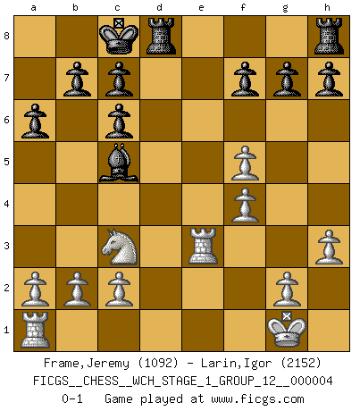 Last move : 0-1 2008 February 3 4:2:12 [Event "FICGS__CHESS__WCH_STAGE_1_GROUP_12__000004"] [Site "FICGS"] [Date "2008.01.08"] [Round "1"] [White "Frame,Jeremy"] [Black "Larin,Igor"] [Result "0-1"] [WhiteElo "1092"] [BlackElo "2152"] 1.e4 e5 2.Nf3 Nc6 3.Bb5 a6 4.Bxc6 dxc6 5.d4 exd4 6.Qxd4 Qxd4 7.Nxd4 Bd7 8.Nc3 O-O-O 9.O-O Bd6 10.f4 Bc5 11.Be3 Nf6 12.Rfe1 Ng4 13.Nf5 Bb4 14.h3 Bxf5 15.exf5 Nxe3 16.Rxe3 Bc5 0-1 Ruy Lopez : Exchange variation Queenside Castling by player Black (move 8) Kingside Castling by player White (move 9) Player Black won this chess game. Follow this game move after move (download)If a ruler does not understand Chess, how can he rule over a kingdom ? (King Khusros II) Der vorletzte Fehler gewinnt. (Savielly Grigorievitsch Tartakower) Bendita sea la memoria de aquel que dio al mundo este juego inmortal. (A. G. Gardiner) Les échecs c'est le défi de l'alpiniste, toujours plus haut, prêt à tout pour monter à l'assaut du Roi ennemi. Les échecs, c'est de la musique en mouvement, un ballet majestueux pour les yeux. C'est de la poésie composée par les fantômes du passé qui au même titre que Rimbaud ou Verlaine méritent notre admiration. Les échecs, c'est de la peinture ou le moindre mouvement modifie le tableau pour en faire un Picasso ou un Van Gogh. Les échecs, c'est tout et rien, c'est la vie et la mort. Jjulie33 sur le forum de France-Echecs. Computers are like Old Testament gods; lots of rules and no mercy. (Joseph Campbell)