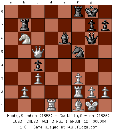Last move : 1-0 2008 March 25 13:10:1 [Event "FICGS__CHESS__WCH_STAGE_1_GROUP_12__000004"] [Site "FICGS"] [Date "2008.01.08"] [Round "1"] [White "Hamby,Stephen"] [Black "Castillo,German"] [Result "1-0"] [WhiteElo "1858"] [BlackElo "1826"] 1.e4 e5 2.Nf3 Nc6 3.d4 exd4 4.Nxd4 Bc5 5.Be3 Qf6 6.c3 Nge7 7.Bc4 Ne5 8.Be2 Qg6 9.O-O d6 10.f3 O-O 11.Nd2 Bh3 12.Rf2 a5 13.Nc4 Rfe8 14.Nb5 Nxc4 15.Bxc5 dxc5 16.Bxc4 Rad8 17.Qa4 c6 18.Nc7 Rf8 19.Qxa5 Rd7 20.Na8 b5 21.Bf1 c4 22.Nb6 Rb7 23.Rd1 Be6 24.a4 f5 25.axb5 cxb5 26.Qxb5 fxe4 27.Qc5 e3 28.Qxe3 Nf5 29.Qc5 1-0 Scotch game Kingside Castling by player White (move 9) Kingside Castling by player Black (move 10) Player White won this chess game. Follow this game move after move (download)Chess is a matter of delicate judgment, knowing when to punch and how to duck. (Bobby Fischer) Dieses schreckliche Gefühl, dass ich gegen eine Maschine spielte, die niemals Fehler macht, zerschmetterte meinen Widerstand. (Mark Taimanov) Solo los afeminados hacen el Enroque. (Rob Sillars) On croit qu'il y a plus de mauvais joueurs que de bons joueurs, c'est faux : Il y a autant de joueurs qui gagnent que de joueurs qui perdent. (Philippe Geluck) Strategy without tactics is the slowest route to victory. Tactics without strategy is the noise before defeat. (Sun Tzu)