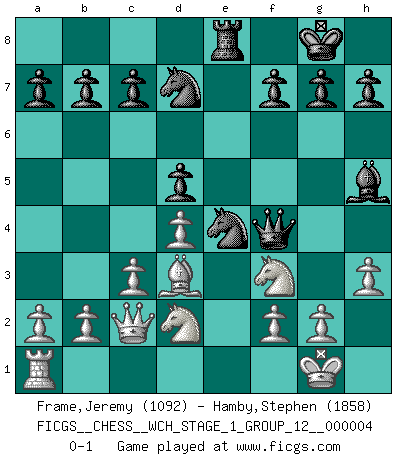 Last move : 0-1 2008 February 17 17:36:48 [Event "FICGS__CHESS__WCH_STAGE_1_GROUP_12__000004"] [Site "FICGS"] [Date "2008.01.08"] [Round "1"] [White "Frame,Jeremy"] [Black "Hamby,Stephen"] [Result "0-1"] [WhiteElo "1092"] [BlackElo "1858"] 1.e4 e6 2.d4 d5 3.exd5 exd5 4.Bf4 Bd6 5.Bxd6 Qxd6 6.Nf3 Nf6 7.Bd3 O-O 8.O-O Bg4 9.Nbd2 Nbd7 10.h3 Bh5 11.c3 Rfe8 12.Re1 Rxe1+ 13.Qxe1 Re8 14.Qd1 Ne4 15.Qc2 Qf4 0-1 French : Exchange variation Kingside Castling by player Black (move 7) Kingside Castling by player White (move 8) Player Black won this chess game. Follow this game move after move (download)Help your pieces so they can help you. (Paul Morphy) Schach ist das Spiel, das die Verrückten gesund hält. (Albert Einstein) El Ajedrez es un juego de pelea el cual es puramente intelectual e incluye la suerte. (Richard Reti) Il n'y a pas eu de défaite parce que je ne crois pas que cet ordinateur ait jamais existé. IBM a triché en refusant d'imprimer les modes de recherche de la machine. C'est évident, pendant le match, des coups décisifs ont été joués par des êtres humains. Aujourd'hui, les meilleurs spécialistes en informatique ne peuvent toujours pas expliquer comment Deep-Blue a pu jouer contre la logique des ordinateurs. IBM a gagné une guerre de communication, mais ils sont incapables de prouver que l'ordinateur a gagné tout seul. (Garry Kasparov) The Movers & Shakers of this world are those who play chess in the mornings and go to the disco in the evenings. (Dinesh De Silva)