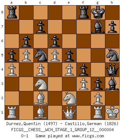 Last move : 0-1 2008 January 29 9:39:30 [Event "FICGS__CHESS__WCH_STAGE_1_GROUP_12__000004"] [Site "FICGS"] [Date "2008.01.08"] [Round "1"] [White "Durnez,Quentin"] [Black "Castillo,German"] [Result "0-1"] [WhiteElo "1497"] [BlackElo "1826"] 1.d4 Nf6 2.c4 g6 3.Nc3 Bg7 4.e4 d6 5.f3 O-O 6.Bd3 e5 7.d5 Nh5 8.Nge2 f5 9.O-O f4 10.b4 a5 11.b5 Nd7 12.a4 b6 13.Qe1 g5 14.Kh1 Qf6 15.Rg1 Nc5 16.Bc2 g4 17.Qf2 g3 18.Qe1 Qh4 19.h3 Bxh3 0-1 King's Indian : Saemisch, 5...O-O Kingside Castling by player Black (move 5) Kingside Castling by player White (move 9) Player Black won this chess game. Follow this game move after move (download)Don't even mention losing to me. I can't stand to think of it. (Bobby Fischer) Es ist peinlich, dass ich nie Weltmeister wurde. Es wäre leicht, Leonid Breschnjew als Ursache vorzuschieben, dessen Apparat den Vorzeigekommunisten Anatoli Karpow in allem unterstützte. Aber Garri Kasparow zum Beispiel, der ebenfalls von den Sowjets unerwünscht war, hat trotz der Widerstände den WM-Titel erobert. (Viktor Kortschnoi) El Ajedrez lo es todo: arte, ciencia y deporte. (Anatoly Karpov) Dieu déplace le joueur, et celui-ci la pièce. Quel Dieu derrière Dieu commence donc la trame ? Arturo Perez-Reverte (prix de littérature policière 1993). Ah, beer! The cause of, and the solution to, all of life's problems. (Homer Simpson)