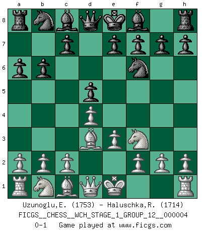 Last move : 0-1 2008 February 24 14:25:23 [Event "FICGS__CHESS__WCH_STAGE_1_GROUP_12__000004"] [Site "FICGS"] [Date "2008.01.08"] [Round "1"] [White "Uzunoglu,Efe Kerem"] [Black "Haluschka,Rainer"] [Result "0-1"] [WhiteElo "1753"] [BlackElo "1714"] 1.d4 Nf6 2.Nf3 d5 3.e3 a6 4.Bd3 b6 0-1 This chess game has been lost on time (started : 2008.01.08 19:57:51) Queen's pawn game Player Black won this chess game. Follow this game move after move (download)Chess is the gymnasium of the mind. (Blaise Pascal) Ich bin stolz ein Bulgare zu sein. (Veselin Topalov) El poder defensivo de una pieza clavada, solamente es imaginario. (Aaron Nimzovich) La solitude du joueur d'Echecs à l'approche du mat est semblable à celle du condamné. (Francis Szpiner) Plans are ideas that never come to fruition. (Daniel Parmet)