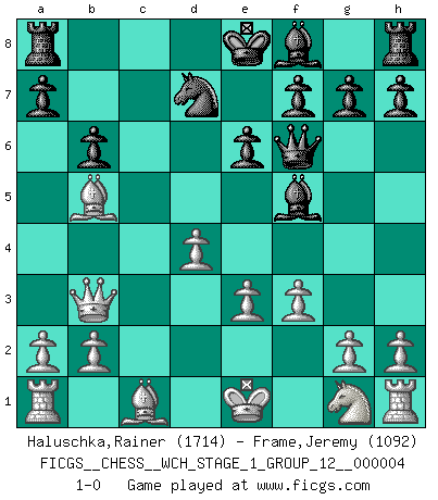 Last move : 1-0 2008 February 18 16:17:20 [Event "FICGS__CHESS__WCH_STAGE_1_GROUP_12__000004"] [Site "FICGS"] [Date "2008.01.08"] [Round "1"] [White "Haluschka,Rainer"] [Black "Frame,Jeremy"] [Result "1-0"] [WhiteElo "1714"] [BlackElo "1092"] 1.d4 d5 2.c4 c6 3.Nc3 Nf6 4.e3 Bf5 5.cxd5 cxd5 6.Qb3 b6 7.Bb5+ Nbd7 8.Nxd5 e6 9.Nxf6+ Qxf6 10.f3 1-0 QGD Slav defense Player White won this chess game. Follow this game move after move (download)The way he plays Chess demonstrates a man's whole nature. (Stanley Ellin) Wenn du gegen Bobby spielst, ist es keine Frage von gewinnen oder verlieren. Es ist eine Frage des Überlebens. (Boris Vassilievich Spassky) Los libros de Ajedrez deben de usarse igual como usamos los anteojos: para mejorar la vista, aunque algunos jugadores los quieren usar como si ellos les otorgaran la vision. (José Raúl Capablanca) Votre prénom est 'Tactique', votre deuxième prénom est 'Tactique' et votre nom est 'Tactique'. (Ken Smith) A journey of a thousand sites begins with a single click. (Author unknown)
