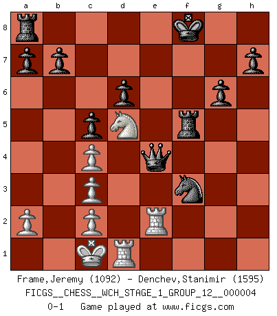 Last move : 0-1 2008 February 12 15:34:16 [Event "FICGS__CHESS__WCH_STAGE_1_GROUP_12__000004"] [Site "FICGS"] [Date "2008.01.08"] [Round "1"] [White "Frame,Jeremy"] [Black "Denchev,Stanimir"] [Result "0-1"] [WhiteElo "1092"] [BlackElo "1595"] 1.e4 c5 2.Bc4 d6 3.Nc3 g6 4.Nf3 Bg7 5.d3 Bg4 6.h3 Bd7 7.Bd2 Nf6 8.O-O O-O 9.Be3 Nc6 10.Qd2 Qc8 11.Rad1 Bxh3 12.gxh3 Qxh3 13.Ng5 Qg4+ 14.Kh2 Qh4+ 15.Nh3 Ng4+ 16.Kg2 Nge5 17.Qe2 Nxc4 18.dxc4 Bxc3 19.bxc3 Qxe4+ 20.f3 Qe6 21.Nf4 Qe5 22.Nd5 f5 23.Qd3 f4 24.Rfe1 fxe3 25.Rxe3 Qg5+ 26.Kf2 Qh4+ 27.Ke2 Qh2+ 28.Ke1 Rf5 29.Rxe7 Kf8 30.Re2 Qh4+ 31.Kd2 Ne5 32.Qe4 Nxf3+ 33.Kc1 Qxe4 0-1 Sicilian defense Kingside Castling by player White (move 8) Kingside Castling by player Black (move 8) Player Black won this chess game. Follow this game move after move (download)Chess is life. (Bobby Fischer) Stil? Ich habe keinen Stil! (Anatoly Karpov) La mitad de las variaciones que son calculadas en una partida de torneo, resultan ser completamente superfluas. Desafortunadamente, nadie sabe por adelantado cual mitad. (Jan Tinman) Si rien de grave n'est détecté lors de l'analyse d'une position, on joue alors le coup. Seconde règle de Blumenfeld. Have no fear of perfection - you'll never reach it. (Salvador Dali)