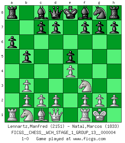 Last move : 1-0 2008 March 3 10:19:50 [Event "FICGS__CHESS__WCH_STAGE_1_GROUP_13__000004"] [Site "FICGS"] [Date "2008.01.08"] [Round "1"] [White "Lennartz,Manfred"] [Black "Natal,Marcos"] [Result "1-0"] [WhiteElo "2151"] [BlackElo "1833"] 1.e4 e5 2.Nf3 Nc6 3.Bb5 a6 4.Ba4 b5 5.Bb3 Na5 6.O-O Nxb3 7.axb3 1-0 Ruy Lopez : Taimanov (chase/wing/Accelerated counterthrust) variation Kingside Castling by player White (move 6) Player White won this chess game. Follow this game move after move (download)Bobby just drops the pieces and they fall on the right squares. (Miguel Najdorf) Früher wurde jeder komplizierte Zug, jedes interessante Opfer mit großem Beifall und Enthusiasmus aufgenommen. Heute schaltet man einfach seinen Fritz an, und man kann sehen, was los ist, ob der Zug geht oder nicht. (Vladimir Kramnik) El muchacho (en ese entonces un niño de 12 años llamado Anatoly Karpov) no tiene ni idea de lo que es el Ajedrez y no hay futuro en absoluto para el en esta profesión. (Mikhail Botvinnik) Les Echecs mettent en conflit, non pas deux intelligences, mais deux volontés. (Lasker) The existence of forgetting has never been proved: We only know that some things don't come to mind when we want them. (Friedrich Nietzsche)
