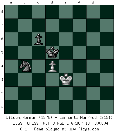 Last move : 0-1 2008 June 2 10:23:44 [Event "FICGS__CHESS__WCH_STAGE_1_GROUP_13__000004"] [Site "FICGS"] [Date "2008.01.08"] [Round "1"] [White "Wilson,Norman"] [Black "Lennartz,Manfred"] [Result "0-1"] [WhiteElo "1576"] [BlackElo "2151"] 1.d4 Nf6 2.c4 e6 3.Nc3 Bb4 4.e3 O-O 5.Nge2 d5 6.cxd5 exd5 7.g3 c6 8.Bg2 Re8 9.Qc2 Nbd7 10.O-O Nf8 11.a3 Bd6 12.f3 Ne6 13.Rd1 a5 14.e4 Qb6 15.Be3 dxe4 16.Nxe4 Nd5 17.Bf2 Be7 18.N2c3 Nec7 19.Na4 Qa7 20.Re1 Bf5 21.Nac5 a4 22.Re2 Nb5 23.Rc1 Bg6 24.Qd2 Rad8 25.Rc4 Nb6 26.Rc1 Nd5 27.Rce1 b6 28.Nd3 f6 29.Bh3 Bf8 30.Qc1 Qb7 31.Rc2 Nd6 32.Bg2 Qa6 33.Nf4 Nxf4 34.gxf4 Nb5 35.Rd1 Na7 36.Bf1 Qb7 37.Rc3 Bf7 38.Qc2 Bd5 39.Re1 f5 40.Ng3 Rxe1 41.Bxe1 g6 42.Qxa4 b5 43.Qc2 Nc8 44.h4 Nb6 45.h5 Re8 46.Qc1 Na4 47.Re3 Rxe3 48.Qxe3 Nxb2 49.Bb4 Qb8 50.Bxf8 Kxf8 51.Qd2 Na4 52.Qe3 Qe8 53.Kf2 Qxe3+ 54.Kxe3 Ke7 55.Be2 Ke6 56.hxg6 hxg6 57.Nh1 Nb6 58.Nf2 Bc4 59.Nd3 Nd5+ 60.Kd2 Bxd3 61.Bxd3 Nxf4 62.Bc2 Kd6 63.a4 b4 64.a5 Kc7 65.Ba4 Nd5 66.Kd3 g5 67.a6 Nb6 68.Bd1 Kb8 69.Kc2 Ka7 70.Be2 Nd5 71.Kd2 Kb6 72.Kc2 g4 73.fxg4 fxg4 74.Kb3 g3 75.Bf1 Ne3 76.Bh3 g2 77.Bxg2 Nxg2 78.Kxb4 Ne3 79.a7 Kxa7 80.Kc5 Kb7 81.Kd6 Nd5 82.Ke5 Kb6 83.Ke4 Kb5 84.Kd3 Kb4 85.Ke4 Kc3 86.Ke5 Nb4 87.Ke4 Kc4 88.Ke3 Kd5 0-1 Nimzo-Indian : 4.e3 O-O Kingside Castling by player Black (move 4) Kingside Castling by player White (move 10) 10 pieces endgame at move 73 : White KBPPP , Black KNPPP WHITE : King + 1 Bishop 3 Pawns BLACK : King + 1 Knight 3 Pawns 9 pieces endgame at move 73 : White KBPP , Black KNPPP WHITE : King + 1 Bishop 2 Pawns BLACK : King + 1 Knight 3 Pawns 8 pieces endgame at move 77 : White KBPP , Black KNPP WHITE : King + 1 Bishop 2 Pawns BLACK : King + 1 Knight 2 Pawns 7 pieces endgame at move 77 : White KPP , Black KNPP WHITE : King + 2 Pawns BLACK : King + 1 Knight 2 Pawns 6 pieces endgame at move 78 : White KPP , Black KNP WHITE : King + 2 Pawns BLACK : King + 1 Knight 1 Pawn 5 pieces endgame at move 79 : White KP , Black KNP WHITE : King + 1 Pawn BLACK : King + 1 Knight 1 Pawn Player Black won this chess game. Follow this game move after move (download)Bobby Fischer's current state of mind is indeed a tragedy. One of the world's greatest Chess players - the pride and sorrow of American Chess. (Frank Brady) Je älter ich werde, um so mehr schätze ich die Bauern. (Paul Keres) Un buen jugador siempre tiene buena suerte. (José Raúl Capablanca) Nous vivons dans un monde échiquéen : chaque jour qui passe est un défi à relever. (Philosophe Sasha) Art disturbs, science reassures. (Georges Braque, Le Jour et la Nuit)