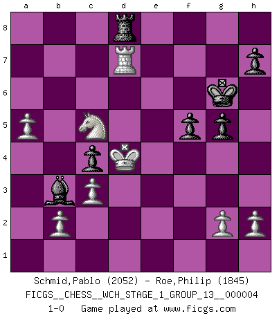 Last move : 1-0 2008 May 26 22:48:0 [Event "FICGS__CHESS__WCH_STAGE_1_GROUP_13__000004"] [Site "FICGS"] [Date "2008.01.08"] [Round "1"] [White "Schmid,Pablo"] [Black "Roe,Philip"] [Result "1-0"] [WhiteElo "2052"] [BlackElo "1845"] 1.d4 Nf6 2.f3 d5 3.e4 dxe4 4.Nc3 exf3 5.Nxf3 c6 6.Bc4 Bf5 7.O-O e6 8.Ng5 Bg6 9.Ne2 Bd6 10.Nf4 Bxf4 11.Bxf4 O-O 12.a4 Nd5 13.Bc1 Nd7 14.Ra3 e5 15.Rb3 exd4 16.Qxd4 Qc7 17.Bxd5 cxd5 18.Qxd5 Qc5+ 19.Qxc5 Nxc5 20.Rb5 Rfc8 21.Be3 b6 22.Bxc5 Rxc5 23.Rxc5 bxc5 24.Rf2 Rb8 25.c3 c4 26.Nf3 f6 27.Rd2 Be8 28.a5 Kf8 29.Nd4 Bd7 30.Kf2 Rc8 31.Nc2 Ke7 32.Rd5 Ke6 33.Nb4 g5 34.Ke3 Ba4 35.Kd4 Bb3 36.Na6 f5 37.Nc5+ Kf6 38.Rd6+ Kf7 39.Rd7+ Kg6 40.Rxa7 Rd8+ 41.Rd7 1-0 This chess game has been lost on time (started : 2008.01.08 19:59:10) Blackmar-Diemer gambit Kingside Castling by player White (move 7) Kingside Castling by player Black (move 11) Player White won this chess game. Follow this game move after move (download)The blunders are all there on the board, waiting to be made. (Savielly Tartakover) Der Knackpunkt bei der Konzentration ist, daß wir nur durch sie etwas Neues und Ungewöhnliches am Schachbrett finden können. Sie ist der einzige Weg durch neue neue Ideen eine Überraschung zu bereiten. (Garry Kasparov) La estratégia requiere pensar, la táctica requiere observación. (Max Euwe) Dieu déplace le joueur, et celui-ci la pièce. Quel Dieu derrière Dieu commence donc la trame ? Arturo Perez-Reverte (prix de littérature policière 1993). First of all, we have to go back to the classical time control. (Anatoly Karpov)