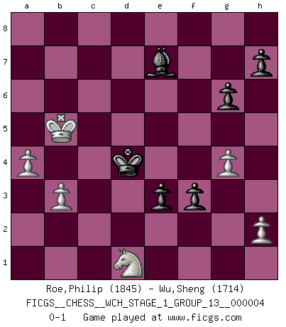 Last move : 0-1 2008 May 2 1:9:37 [Event "FICGS__CHESS__WCH_STAGE_1_GROUP_13__000004"] [Site "FICGS"] [Date "2008.01.08"] [Round "1"] [White "Roe,Philip"] [Black "Wu,Sheng"] [Result "0-1"] [WhiteElo "1845"] [BlackElo "1714"] 1.Nc3 c5 2.Nf3 Nc6 3.d4 cxd4 4.Nxd4 Nf6 5.Bg5 e6 6.e4 d6 7.Qd2 a6 8.O-O-O Bd7 9.f3 b5 10.Kb1 Be7 11.g4 b4 12.Nce2 Nxe4 13.fxe4 Bxg5 14.Nxc6 Bxc6 15.Qxb4 Rb8 16.Qxd6 Qxd6 17.Rxd6 Bxe4 18.Rg1 Bf6 19.b3 Ke7 20.Rd2 Rhd8 21.Rxd8 Rxd8 22.Kc1 Bg5+ 23.Kb2 Rd1 24.Bh3 Rd2 25.Ng3 Rxc2+ 26.Ka3 Bd5 27.Re1 Kd7 28.Re2 Be7+ 29.Ka4 Rc5 30.Bg2 g6 31.Rd2 Kc6 32.Bxd5+ Rxd5 33.Rxd5 Kxd5 34.Ka5 f5 35.Kxa6 f4 36.Ne2 e5 37.Kb5 f3 38.Nc3+ Kd4 39.Nd1 e4 40.a4 e3 0-1 Dunst (Sleipner, Heinrichsen) Opening Queenside Castling by player White (move 8) Player Black won this chess game. Follow this game move after move (download)Pawn endings are to Chess what putting is to golf. (Cecil Purdy) Wenn es im Universum noch irgendwo intelligente Lebewesen gibt, dann kennen sie Go. (Emanuel Lasker) Las leyes del Ajedrez no permiten una libre elección: tienes que mover quieras o no. (Emanuel Lasker) Mais l'homme est une créature légère et illogique : semblable au joueur d'échecs, il n'aime que le processus du but à atteindre, non le but lui-même. (Dostoïevsky) No man has ever achieved immortality in his own life time. (Unknown)