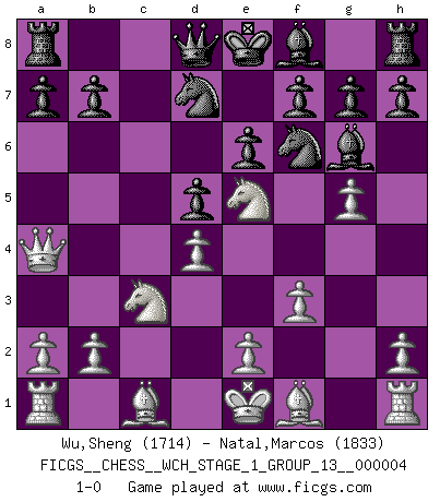 Last move : 1-0 2008 March 11 15:54:56 [Event "FICGS__CHESS__WCH_STAGE_1_GROUP_13__000004"] [Site "FICGS"] [Date "2008.01.08"] [Round "1"] [White "Wu,Sheng"] [Black "Natal,Marcos"] [Result "1-0"] [WhiteElo "1714"] [BlackElo "1833"] 1.d4 d5 2.c4 c6 3.Nf3 Nf6 4.Nc3 Bg4 5.Ne5 Bh5 6.cxd5 cxd5 7.Qa4+ Nbd7 8.f3 e6 9.g4 Bg6 10.g5 1-0 This chess game has been lost on time (started : 2008.01.08 19:59:10) QGD Slav : 4.Nc3 Player White won this chess game. Follow this game move after move (download)Bobby is the finest Chess player this country ever produced. His memory for the moves, his brilliance in dreaming up combinations, and his fierce determination to win are uncanny. (John Collins) Der Traum, für den ich lebe, ist der von einem freien Russland. Viele mögen sagen: Russland hat doch ein Parlament, einen gewählten Präsidenten. Aber ich spüre, dass in meiner Heimat die Angst wiederkehrt. Eine Angst, sich frei zu äußern, bestimmte Dinge zu tun (Garry Kasparov) El jugador táctico sabe que hacer cuando hay algo que hacer; mientras que el estratega sabe que hacer cuando no hay nada que hacer. (Gerald Abrahams) Mais n'est-ce pas déjà le limiter injurieusement que d'appeler les échecs un jeu? N'est-ce pas aussi une science, un art, ou quelque chose qui, comme le cercueil de Mahomet entre ciel et terre, est suspendu entre l'un et l'autre, et qui réunit un nombre incroyable de contraires ? (Stefan Zweig) To err is human, to shift the blame on someone else is tactical. (Mladen Jankovic)
