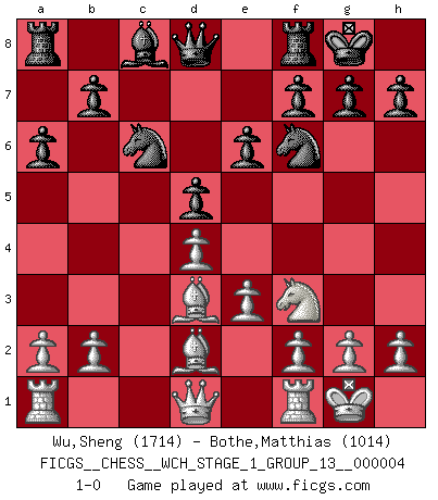 Last move : 1-0 2008 March 6 3:15:1 [Event "FICGS__CHESS__WCH_STAGE_1_GROUP_13__000004"] [Site "FICGS"] [Date "2008.01.08"] [Round "1"] [White "Wu,Sheng"] [Black "Bothe,Matthias"] [Result "1-0"] [WhiteElo "1714"] [BlackElo "1014"] 1.d4 d5 2.Nf3 e6 3.c4 dxc4 4.e3 Nc6 5.Bxc4 Nf6 6.O-O Bd6 7.Nc3 O-O 8.Nb5 a6 9.Nxd6 cxd6 10.Bd2 d5 11.Bd3 1-0 This chess game has been lost on time (started : 2008.01.08 19:59:10) Queen's pawn game Kingside Castling by player White (move 6) Kingside Castling by player Black (move 7) Player White won this chess game. Follow this game move after move (download)Chess, like love, is infectious at any age. (Flohr) Vielleicht wirkt die Aura früherer Spieler glanzvoller als die der heutigen Spieler, aber das liegt daran, dass man kein Programm wie Fritz hatte, das einem all die Löcher in ihren Partien zeigt. (Vladimir Kramnik) Aunque la mayoría de la gente disfruta observar las partidas de los grandes Maestros de ataque, algunos de los jugadores mas notables en la historia han sido los jugadores silenciosos posicionales. Lentamente ellos te aplastan despojandote de tu espacio, congestionando tus piezas y dejandote virtualmente sin nada que hacer. (Yasser Seirawan) Les Echecs sont et restent toujours un combat, un combat intégral comme la boxe, la lutte ou un autre sport, et où il doit y avoir un vainqueur et un vaincu. (Joseph Emil Diemer) If passion drives you, let reason holds the reins. (Benjamin Franklin)