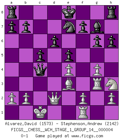 Last move : 0-1 2008 January 30 16:14:32 [Event "FICGS__CHESS__WCH_STAGE_1_GROUP_14__000004"] [Site "FICGS"] [Date "2008.01.08"] [Round "1"] [White "Alvarez,David"] [Black "Stephenson,Andrew"] [Result "0-1"] [WhiteElo "1573"] [BlackElo "2142"] 1.e4 c5 2.Nc3 Nc6 3.g3 g6 4.Bg2 Bg7 5.d3 d6 6.Be3 e5 7.Nh3 Nge7 8.Qd2 Nd4 9.O-O-O Bg4 10.Rdf1 Nf3 11.Bxf3 Bxf3 12.Rhg1 h6 13.g4 Qd7 14.Nb5 Qxb5 15.Rg3 Bxe4 16.c4 Qa6 17.dxe4 Qxc4+ 0-1 Sicilian : Closed, 6.Be3 Queenside Castling by player White (move 9) Player Black won this chess game. Follow this game move after move (download)Everything is in a state of flux, and this includes the world of Chess. (Mikhail Botvinnik) Ich brauche nur einen Blick auf das Schachbrett zu werfen, und weiß schon, was in der Stellung steckt, was geschehen kann und was geschehen wird. Alle übrigen suchen und prüfen, ich aber weiß es! (José Raúl Capablanca) Existen dos clases de sacrificios: los correctos y los míos. (Mikhail Tal) Le jeu d'échecs est comme rejeté hors du temps. (Antoine de Saint-Exupéry) All men can see these tactics whereby I conquer, but what none can see is the strategy out of which victory is evolved. (Sun Tzu)