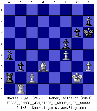 Last move : 1/2-1/2 2006 September 12 15:6:44 [Event "FICGS__CHESS__WCH_STAGE_1_GROUP_M_02__000001"] [Site "FICGS"] [Date "2006.07.01"] [Round "1"] [White "Davies,Nigel"] [Black "Weber,Karlheinz"] [Result "1/2-1/2"] [WhiteElo "2457"] [BlackElo "2343"] 1.f4 d5 2.Nf3 g6 3.g3 Bg7 4.Bg2 Nf6 5.O-O O-O 6.d3 c5 7.Qe1 Nc6 8.e4 dxe4 9.dxe4 e5 10.Nc3 Nd4 11.Qd2 exf4 12.gxf4 Ng4 13.e5 Be6 14.h3 Nh6 15.Ne4 Rc8 16.Nfg5 Qe7 17.Nxe6 Nxe6 18.b4 Rfd8 19.Nd6 Qc7 20.Qf2 Rxd6 21.exd6 Qxd6 22.bxc5 Nxc5 23.Rb1 b6 24.Bb2 Bxb2 25.Rxb2 Nf5 26.R2b1 Qf6 27.Rbe1 Ne6 28.Be4 Ned4 29.Bd3 Rc3 30.Re5 Kg7 31.Rd1 Ra3 32.Rd5 b5 33.Kh2 b4 34.Be4 Rxa2 35.R1xd4 Nxd4 36.Qxd4 Qxd4 37.Rxd4 b3 38.Rd1 f5 39.Bd3 a5 40.Kg2 a4 41.Rb1 Kh6 1/2-1/2 Bird's Opening Kingside Castling by player White (move 5) Kingside Castling by player Black (move 5) This chess game ended in a draw. Follow this game move after move (download)It began to feel as though you were playing against Chess itself. - On playing against Robert Fischer. (Walter Shipman) Schach ist ein Teil der Kultur, und wenn es mit der Kultur abwärts geht, geht es auch mit dem Schach abwärts. (Mikhail Moiseyevich Botvinik) Si el Ajedrez es una ciencia, es la mas inexacta. Si el Ajedrez es un arte, es demasiado inexacto para ser visto como tal. Si el Ajedrez es un deporte, es demasiado esotérico. Si el Ajedrez es un juego, es demasiado exigente para ser solo un juego. Si el Ajedrez es una aventura, es una muy demandante. Si el Ajedrez es una pasión, es una muy gratificante. Si el Ajedrez es la vida, es una muy triste. (Anónimo) Vous m'avez demandé de vous exposer quel est le fondement de la prière. Je ne fais que préparer les pièces du jeu sur la table... Nous sera-t-il permis d'en adopter les règles et si nous les appliquons scrupuleusement nous ne tarderons pas à faire mat le Roi divin ! Il ne pourra échapper à nos mains. (Sainte Thérèse d'Avila, Chemin de perfection) The obstacle is the path. (Zen proverb)