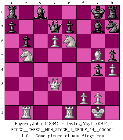Last move : 1-0 2008 January 25 21:13:21 [Event "FICGS__CHESS__WCH_STAGE_1_GROUP_14__000004"] [Site "FICGS"] [Date "2008.01.08"] [Round "1"] [White "Eygard,John"] [Black "Inving,Yugi"] [Result "1-0"] [WhiteElo "1834"] [BlackElo "0914"] 1.c4 Nf6 2.Nf3 g6 3.d4 Bg7 4.Nc3 O-O 5.Bg5 d6 6.e4 h6 7.Bf4 Na6 8.Be2 c5 9.d5 Qb6 10.Rb1 Bd7 11.O-O Qc7 12.h3 Nh5 13.Be3 Nf6 14.Qd2 g5 15.a3 b6 16.b4 Rfd8 17.h4 g4 18.Ne1 h5 19.Nd3 Kh7 20.Bg5 cxb4 21.axb4 Rh8 22.Nf4 Bc8 23.Nb5 Qd8 24.Bd3 Kg8 25.Nd4 Nb8 26.Qe3 Qc7 27.Nb5 Qd8 28.c5 dxc5 29.bxc5 Na6 30.e5 Nxc5 31.d6 Nxd3 32.Qxd3 Qd7 33.Rfe1 Nh7 34.e6 fxe6 35.Nxe6 1-0 English Opening Kingside Castling by player Black (move 4) Kingside Castling by player White (move 11) Player White won this chess game. Follow this game move after move (download)Chess holds its master in its own bonds, shackling the mind and brain so that the inner freedom of the very strongest must suffer. (Albert Einstein) Kleine Schachspieler machen Mist, und große Schachspieler machen Mist, aber große machen weniger Mist. (Fritz Sämisch) Cuando veas una buena jugada, trata de encontrar otra mejor. (Emanuel Lasker) A ce moment-là, je menaçais de comprendre la position ! (Clément L'Heureux) For to win one hundred victories in one hundred battles is not the acme of skill. To subdue the enemy without fighting is the acme of skill. (Sun Tzu)