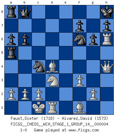 Last move : 1-0 2008 February 28 4:51:40 [Event "FICGS__CHESS__WCH_STAGE_1_GROUP_14__000004"] [Site "FICGS"] [Date "2008.01.08"] [Round "1"] [White "Faust,Dieter"] [Black "Alvarez,David"] [Result "1-0"] [WhiteElo "1718"] [BlackElo "1573"] 1.e4 d6 2.d4 Nf6 3.Nc3 g6 4.Nf3 Bg7 5.h3 O-O 6.Be3 c5 7.dxc5 Qa5 8.Nd2 dxc5 9.Nb3 Qc7 10.Nxc5 b6 11.Nd3 Bb7 12.f3 Nc6 13.Qd2 Rfd8 14.O-O-O a6 15.Qf2 Nd7 16.Nd5 Qb8 17.h4 Nce5 18.Nxe7+ Kh8 19.Nd5 Bxd5 20.exd5 Nc4 21.Bd4 Nf6 22.h5 Rxd5 23.h6 Bxh6+ 24.Rxh6 Ra5 25.Qh4 1-0 Pirc : Classical, h3 system Kingside Castling by player Black (move 5) Queenside Castling by player White (move 14) Player White won this chess game. Follow this game move after move (download)Chess, like any creative activity, can exist only through the combined efforts of those who have creative talent, and those who have the ability to organize their creative work. (Mikhail Botvinnik) Ein Buch ist ein Spiegel; wenn ein Affe hineinsieht, so kann kein Apostel heraus gucken. (Georg Christoph Lichtenberg) Hay jugadores fuertes y personas amables y yo soy un jugador fuerte. (Bobby Fischer) Karpov est une pièce de musée. (Garry Kasparov) A good player is always lucky. (Capablanca)