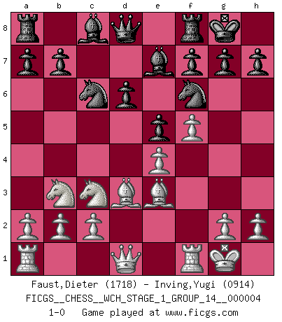 Last move : 1-0 2008 January 22 1:54:3 [Event "FICGS__CHESS__WCH_STAGE_1_GROUP_14__000004"] [Site "FICGS"] [Date "2008.01.08"] [Round "1"] [White "Faust,Dieter"] [Black "Inving,Yugi"] [Result "1-0"] [WhiteElo "1718"] [BlackElo "0914"] 1.e4 c5 2.Nf3 Nc6 3.d4 cxd4 4.Nxd4 Qb6 5.Nb3 Nf6 6.Nc3 e6 7.Be3 Qc7 8.Bd3 Be7 9.Nb5 Qd8 10.f4 e5 11.O-O d6 12.Nc3 O-O 13.f5 1-0 Sicilian defense Kingside Castling by player White (move 11) Kingside Castling by player Black (move 12) Player White won this chess game. Follow this game move after move (download)Suddenly it was obvious to me in my analysis I had missed what Fischer had found with the greatest of ease at the board. (Mikhail Botvinnik) Schach ist die gewalttätigste aller Sportarten. (Garry Kasparov) La vida es como el Ajedrez, con lucha, competición y eventos buenos y malos. (Benjamin Franklin) Seul un grand joueur sait à quel point il joue faiblement. (Xavier Tartacover) Fortune favours the audacious. (Desiderius Erasmus)