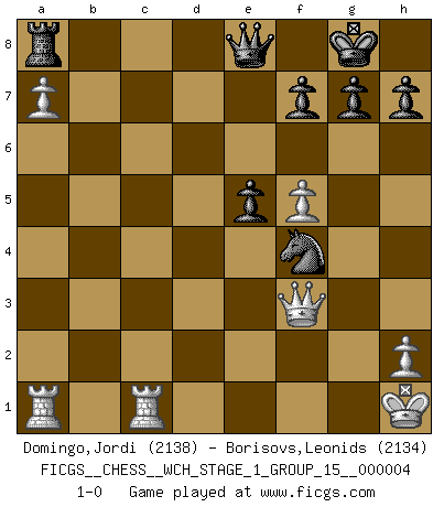 Last move : 1-0 2008 March 1 20:3:44 [Event "FICGS__CHESS__WCH_STAGE_1_GROUP_15__000004"] [Site "FICGS"] [Date "2008.01.08"] [Round "1"] [White "Domingo,Jordi"] [Black "Borisovs,Leonids"] [Result "1-0"] [WhiteElo "2138"] [BlackElo "2134"] 1.e4 c5 2.Nf3 Nc6 3.d4 cxd4 4.Nxd4 e5 5.Nb5 d6 6.c4 Be7 7.N1c3 a6 8.Na3 Be6 9.Nc2 Bg5 10.Bxg5 Qxg5 11.Nd5 Rc8 12.g3 Nf6 13.Bg2 O-O 14.O-O b5 15.f4 exf4 16.gxf4 Qh6 17.cxb5 axb5 18.Nce3 Bxd5 19.Nxd5 Nxd5 20.Qxd5 Ne7 21.Qxb5 Rc2 22.a4 Rfc8 23.a5 Qg6 24.Qg5 Qe6 25.a6 Rxb2 26.Kh1 Ra8 27.Rfc1 Ng6 28.Qg3 Qe8 29.e5 dxe5 30.f5 Nf4 31.Be4 Re2 32.Qf3 Rxe4 33.Qxe4 Nh3 34.Qf3 Nf4 35.a7 1-0 Sicilian : Labourdonnais-Loewenthal (Kalashnikov) variation Kingside Castling by player Black (move 13) Kingside Castling by player White (move 14) Player White won this chess game. Follow this game move after move (download)Chess books should be used as we use glasses: to assist the sight, although some players make use of them as if they thought they conferred sight. (Jose Raul Capablanca) Wenn Du einsam bist, wenn Du Dich in der Welt wie ein Fremder fühlst, spiele Schach. Das wird Deinen Geist erheben und Dein Ratgeber im Kampf sein. (Aristoteles) Diferente gente reacciona diferentemente en aceptar la derrota. (Bobby Fischer) 'L'échange des dames est un coup dur pour les deux adversaires...' Un journaliste lors d'une partie du match Spassky-Fischer The meaning of life is that it is to be lived, and it is not to be traded and conceptualized and squeezed into a pattern of systems. (Bruce Lee)