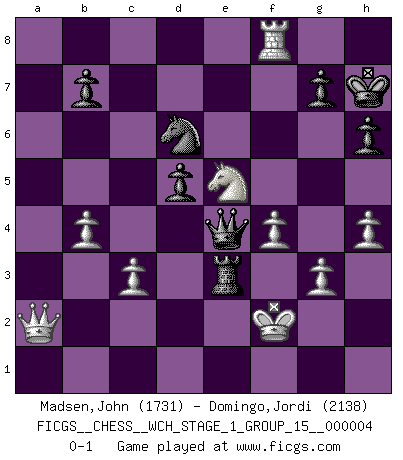 Last move : 0-1 2008 February 28 14:29:5 [Event "FICGS__CHESS__WCH_STAGE_1_GROUP_15__000004"] [Site "FICGS"] [Date "2008.01.08"] [Round "1"] [White "Madsen,John"] [Black "Domingo,Jordi"] [Result "0-1"] [WhiteElo "1731"] [BlackElo "2138"] 1.e4 e5 2.d4 exd4 3.Nf3 d6 4.Nxd4 Nf6 5.Nc3 Be7 6.g3 d5 7.e5 Ng4 8.e6 Nf6 9.exf7+ Kxf7 10.Bg2 c6 11.O-O Re8 12.Re1 Na6 13.Bf4 Bg4 14.Qd2 Qd7 15.a3 Bh3 16.Bxh3 Qxh3 17.b4 Kg8 18.Nf3 Qh5 19.Kg2 Nd7 20.h3 Bf6 21.Nh2 Ne5 22.Bxe5 Bxe5 23.Ng4 Nc7 24.Nxe5 Rxe5 25.f4 R5e8 26.Qd3 Qf7 27.Rad1 a6 28.Na4 a5 29.Nc3 axb4 30.axb4 Na6 31.Qd4 Nc7 32.Qd3 Ra3 33.Qd2 Qg6 34.Ra1 Rxa1 35.Rxa1 Qd6 36.Ne2 Re4 37.c3 Nb5 38.Ra8+ Kf7 39.Kf2 Qe6 40.Ng1 h6 41.Qd3 Nd6 42.h4 Nf5 43.Nf3 Re3 44.Qd2 Qe4 45.Ne5+ Ke7 46.Qa2 Nd6 47.Nxc6+ Kf6 48.Rf8+ Kg6 49.Ne5+ Kh7 0-1 Centre game Kingside Castling by player White (move 11) Player Black won this chess game. Follow this game move after move (download)First-class players lose to second-class players because second-class players sometimes play a first-class game. (Siegbert Tarrasch) Jede Eröffnung ist gut genug um gespielt zu werden, wenn nur ihr Ruf schlecht genug ist. (Savielly Grigorievitsch Tartakower) El Ajedrez es sobre todo, ¡una pelea!. (Emanuel Lasker) Les Echecs ne sont pas pour les âmes timides. Ils requièrent un homme entier, qui ne s'arrête pas aveuglément à ce qui a été déjà établi, mais qui tente individuellement de sonder les profondeurs du jeu. (W. Steinitz) I believe in luck. How else can you explain the success of those you dislike ? (Jean Cocteau)