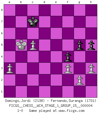 Last move : 1-0 2008 April 20 16:17:1 [Event "FICGS__CHESS__WCH_STAGE_1_GROUP_15__000004"] [Site "FICGS"] [Date "2008.01.08"] [Round "1"] [White "Domingo,Jordi"] [Black "Fernando,Suranga"] [Result "1-0"] [WhiteElo "2138"] [BlackElo "1731"] 1.e4 e5 2.Nf3 Nc6 3.Bc4 Nf6 4.Ng5 d5 5.exd5 b5 6.Bf1 Qxd5 7.Nc3 Qc5 8.Bxb5 Be7 9.b4 Qb6 10.Qf3 Bd7 11.Nge4 Nxe4 12.Qxe4 f5 13.Qd5 O-O-O 14.O-O Kb8 15.Rb1 Be8 16.Qc4 Nd4 17.Bxe8 Rhxe8 18.d3 Bh4 19.b5 Qe6 20.Qa4 Qb6 21.Rb4 Be7 22.Rc4 Bc5 23.Kh1 h6 24.Be3 g5 25.f3 Qd6 26.Ne2 Bb6 27.Nxd4 exd4 28.Rc6 Qe5 29.Bf2 Rd6 30.h3 Qf6 31.Rxd6 Qxd6 32.Kg1 Qd5 33.Re1 Rxe1+ 34.Bxe1 Kb7 35.Kf1 Qc5 36.Qc4 Qxc4 37.dxc4 c6 38.bxc6+ Kxc6 39.Ke2 Kd6 40.Kd3 f4 41.Bb4+ Bc5 42.Bxc5+ Kxc5 43.c3 dxc3 44.Kxc3 a6 45.a3 a5 46.Kd3 a4 47.Kc3 h5 48.Kd3 Kc6 49.Kd4 Kd6 50.c5+ Kc6 51.Kc4 Kd7 52.Kb5 Kc7 53.Kxa4 Kc6 54.Kb4 Kc7 55.Kb5 1-0 Two knights defense : Ulvestad variation Queenside Castling by player Black (move 13) Kingside Castling by player White (move 14) 10 pieces endgame at move 53 : White KPPPPP , Black KPPP WHITE : King + 5 Pawns BLACK : King + 3 Pawns Player White won this chess game. Follow this game move after move (download)A Chess game is a dialogue, a conversation between a player and his opponent. Each move by the opponent may contain threats or be a blunder, but a player cannot defend against threats or take advantage of blunders if he does not first ask himself: What is my opponent planning after each move ? (Bruce A. Moon) Ich moechte nie einem Club beitreten, der Leute wie mich als Mitglieder aufnimmt. (Woody Allen) El Ajedrez es 99 por ciento táctica. (Teichmann) Vous savez, camarade Pachman, je n'éprouve pas de plaisir à être ministre, je jouerais plutôt aux échecs comme vous, ou alors ferais une révolution au Venezuela. (Che Guevara à Ludek Pachman, 'Checkmate in Prague', 1975) Art is not a thing, it is a way. (Elbert Hubbard)