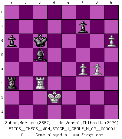 Last move : 0-1 2006 November 14 3:1:14 [Event "FICGS__CHESS__WCH_STAGE_1_GROUP_M_02__000001"] [Site "FICGS"] [Date "2006.07.01"] [Round "1"] [White "Zubac,Marius"] [Black "de Vassal,Thibault"] [Result "0-1"] [WhiteElo "2387"] [BlackElo "2424"] 1.d4 d5 2.c4 c6 3.Nc3 Nf6 4.Nf3 e6 5.Bg5 dxc4 6.e4 b5 7.e5 h6 8.Bh4 g5 9.Nxg5 hxg5 10.Bxg5 Nbd7 11.exf6 Bb7 12.g3 c5 13.d5 Nxf6 14.Bg2 Bh6 15.Bxf6 Qxf6 16.O-O O-O-O 17.Nxb5 a6 18.Nc3 exd5 19.Re1 Kb8 20.Na4 Bc6 21.Nxc5 Ka7 22.h4 Rhe8 23.Rb1 Bf8 24.Rxe8 Bxe8 25.b4 Bc6 26.Rc1 Rb8 27.Qd2 Bh6 28.f4 Bg7 29.Rd1 d4 30.Re1 d3 31.Re5 Qd6 32.Qe3 Bxg2 33.Re7 Ka8 34.Kxg2 Qd5+ 35.Qf3 Qxf3+ 36.Kxf3 d2 37.Rd7 c3 38.Nb3 Rxb4 39.Nxd2 Kb8 40.Rd5 Bd4 41.a3 cxd2 42.Ke2 Ra4 43.Kxd2 Bf2 44.Rd3 Kc7 45.h5 Re4 46.Rf3 Bc5 47.g4 Ra4 48.Rc3 Kc6 49.h6 Rxa3 0-1 Comment by player 2 : Thibault de Vassal : Thanks for the dangerous game, Marius... :) Best wishes in your other games. QGD Slav defense Kingside Castling by player White (move 16) Queenside Castling by player Black (move 16) 10 pieces endgame at move 49 : White KRPPP , Black KRBPP WHITE : King + 1 Rook 3 Pawns BLACK : King + 1 Rook 1 Bishop 2 Pawns Player Black won this chess game. Follow this game move after move (download)Chess, like love, like music, has the power to make people happy. (Siegbert Tarrasch) Schach ist eine Sache der genauen Beurteilung, wann man zuschlagen und wann man sich ducken muss. (Robert James Fischer) El jugador de combinación piensa hacia adelante; comienza de la posición dada y trabaja las movidas contundentes en su mente. (Emanuel Lasker) La tactique, c'est ce que vous faites quand il y a quelque chose à faire; la stratégie, c'est ce que vous faites quand il n'y a rien à faire. (Savielli Tartacower) Life is pleasant. Death is peaceful. It's the transition that's troublesome. (Isaac Asimov)