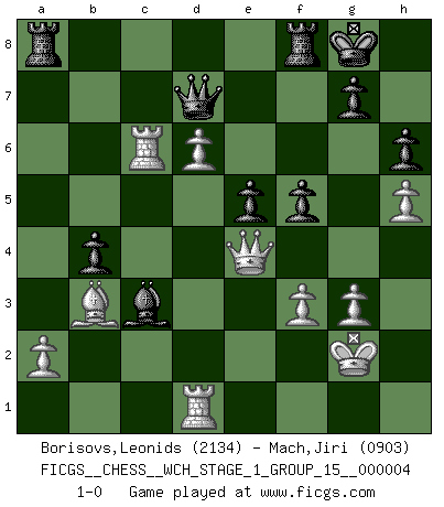 Last move : 1-0 2008 May 13 1:58:56 [Event "FICGS__CHESS__WCH_STAGE_1_GROUP_15__000004"] [Site "FICGS"] [Date "2008.01.08"] [Round "1"] [White "Borisovs,Leonids"] [Black "Mach,Jiri"] [Result "1-0"] [WhiteElo "2134"] [BlackElo "0903"] 1.e4 e5 2.Nf3 Nc6 3.Bb5 a6 4.Ba4 Nf6 5.O-O Be7 6.Re1 b5 7.Bb3 d6 8.c3 O-O 9.h3 Bb7 10.d4 Re8 11.Nbd2 Bf8 12.d5 Nb8 13.Nf1 Nbd7 14.N3h2 Nc5 15.Bc2 c6 16.b4 Ncd7 17.dxc6 Bxc6 18.Bg5 h6 19.Bxf6 Nxf6 20.Ng4 a5 21.Nxf6+ Qxf6 22.Ne3 axb4 23.cxb4 d5 24.Nxd5 Bxd5 25.exd5 Bxb4 26.Re2 Bc3 27.Rc1 b4 28.Ba4 Red8 29.Bb3 Qf4 30.g3 Qf5 31.Kg2 Rd6 32.f3 Rf6 33.Re4 Qg5 34.h4 Qg6 35.Qe2 Rfa6 36.Rc4 Qd6 37.h5 Rf8 38.Rd1 R6a8 39.Rc6 Qd7 40.Qe4 f5 41.d6 1-0 Ruy Lopez : Closed Kingside Castling by player White (move 5) Kingside Castling by player Black (move 8) Player White won this chess game. Follow this game move after move (download)Chess demands total concentration. (Bobby Fischer) Im Schach gewinnt jeder. Hat man Freunde am Spiel - und das ist die Hauptsache - ist auch der Verlust einer Partie kein Unglück. (David Bronstein) Aún deseo matar a Fischer. (Boris Spassky) Karpov est une pièce de musée. (Garry Kasparov) You can only get smarter by playing a smarter opponent. (Revolver, movie)