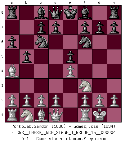Last move : 0-1 2008 March 9 15:53:8 [Event "FICGS__CHESS__WCH_STAGE_1_GROUP_15__000004"] [Site "FICGS"] [Date "2008.01.08"] [Round "1"] [White "Porkolab,Sandor"] [Black "Gomez,Jose"] [Result "0-1"] [WhiteElo "1838"] [BlackElo "1834"] 1.e4 e5 2.Nf3 Nc6 3.Bb5 a6 4.Ba4 Nf6 5.O-O b5 0-1 This chess game has been lost on time (started : 2008.01.08 20:1:57) Ruy Lopez : 5.O-O Kingside Castling by player White (move 5) Player Black won this chess game. Follow this game move after move (download)Chess is a forcing house where the fruits of character can ripen more fully than in life. (Edward Morgan Foster) Über Kasparov: Es ist offensichtlich, daß er in einem totalitären Staat aufwuchs und deshalb zu diktatorischen Zügen neigt. (Viktor Kortschnoi) La pasion por jugar al Ajedrez es una de las mas inexplicables en el mundo. (H.G. Wells) La vie et les Echecs sont tous les deux une lutte constante. (Lasker) Internet: Absolute communication, absolute isolation. (Paul Carvel)