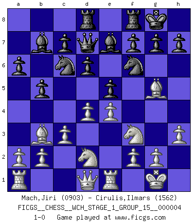 Last move : 1-0 2008 April 25 20:37:38 [Event "FICGS__CHESS__WCH_STAGE_1_GROUP_15__000004"] [Site "FICGS"] [Date "2008.01.08"] [Round "1"] [White "Mach,Jiri"] [Black "Cirulis,Ilmars"] [Result "1-0"] [WhiteElo "0903"] [BlackElo "1562"] 1.e4 e5 2.Nf3 Nc6 3.Bb5 a6 4.Ba4 Nf6 5.O-O Be7 6.Re1 b5 7.Bb3 O-O 8.c3 Bb7 9.d4 d6 10.h3 Qd7 11.Bg5 Rad8 12.Nbd2 1-0 This chess game has been lost on time (started : 2008.01.08 20:1:57) Ruy Lopez : Closed, 7...O-O Kingside Castling by player White (move 5) Kingside Castling by player Black (move 7) Player White won this chess game. Follow this game move after move (download)Examine moves that smite! A good eye for smites is far more important than a knowledge of strategical principles. (Purdy) Ich moechte nie einem Club beitreten, der Leute wie mich als Mitglieder aufnimmt. (Woody Allen) Nada excita más a Grandes Maestros aburridos que una novedad teórica. (Dominic Lawson) Karpov est une pièce de musée. (Garry Kasparov) The greatest con, that he ever pulled... was making you believe... that he is you. (Revolver, movie)