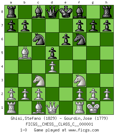 Last move : 1-0 2006 May 16 6:2:30 [Event "FICGS__CHESS__CLASS_C__000001"] [Site "FICGS"] [Date "2006.04.13"] [Round "1"] [White "Ghisi,Stefano"] [Black "Gourdin,Jose"] [Result "1-0"] [WhiteElo "1829"] [BlackElo "1779"] 1.e4 c6 2.Nc3 d5 3.exd5 cxd5 4.Nf3 Nf6 5.Bb5 Nc6 6.O-O e6 7.d4 1-0 Caro-Kann defense Kingside Castling by player White (move 6) Player White won this chess game. Follow this game move after move (download)It was clear to me that the vulnerable point of the American Grandmaster (Bobby Fischer) was in double-edged, hanging, irrational positions, where he often failed to find a win even in a won position. (Efim Geller) Wenn du auf das Glück wartest, wird das Leben ziemlich langweilig. (Mikhail Nekhemyevich Tal) Para mi, el Ajedrez es la vida y cada partida es como una nueva vida. Todo jugador de Ajedrez suele vivir muchas vidas durante su vida. (Eduard Gufeld) Aux échecs, les retours au sommet sont rares : les dommages psychologiques consécutifs à une défaite sont trop sévères. (Daily Telegraph) Memory... is the diary that we all carry with us. (Oscar Wilde, The Importance of Being Earnest)