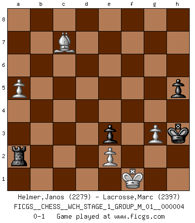 Last move : 0-1 2008 May 5 18:58:3 [Event "FICGS__CHESS__WCH_STAGE_1_GROUP_M_01__000004"] [Site "FICGS"] [Date "2008.01.08"] [Round "1"] [White "Helmer,Janos"] [Black "Lacrosse,Marc"] [Result "0-1"] [WhiteElo "2279"] [BlackElo "2397"] 1.d4 Nf6 2.Nf3 c5 3.c4 cxd4 4.Nxd4 e5 5.Nb5 d6 6.N1c3 a6 7.Na3 b5 8.cxb5 d5 9.g3 Bxa3 10.bxa3 Qc7 11.Qb3 d4 12.Bg2 Bb7 13.Nd5 Nxd5 14.Bxd5 O-O 15.O-O Nd7 16.Rb1 axb5 17.Bxb7 Qxb7 18.Qxb5 Qxb5 19.Rxb5 f6 20.Rd1 Rfc8 21.Rd5 Nb6 22.Rb5 Na4 23.Bd2 Rc2 24.Kf1 Rxa2 25.Bb4 Rc8 26.f4 Nb2 27.Rd2 Ra1+ 28.Kf2 Nc4 29.Rd3 Re8 30.fxe5 fxe5 31.Rc5 Ne3 32.Rxe3 dxe3+ 33.Kxe3 g5 34.Rc7 Rh1 35.a4 Rxh2 36.a5 Re6 37.Re7 Rxe7 38.Bxe7 Kf7 39.Bxg5 Ke6 40.Kf3 Kf5 41.Bd8 e4+ 42.Ke3 Rh1 43.Bb6 Ra1 44.Kd4 h5 45.Bc7 Rc1 46.Bb8 Rd1+ 47.Ke3 Ra1 48.Bc7 Ra2 49.Bd8 Ra3+ 50.Kf2 Kg4 51.Bc7 e3+ 52.Kg2 Ra2 53.Kf1 Kh3 0-1 Queen's pawn game Kingside Castling by player Black (move 14) Kingside Castling by player White (move 15) 10 pieces endgame at move 38 : White KBPPP , Black KRPPP WHITE : King + 1 Bishop 3 Pawns BLACK : King + 1 Rook 3 Pawns 9 pieces endgame at move 39 : White KBPPP , Black KRPP WHITE : King + 1 Bishop 3 Pawns BLACK : King + 1 Rook 2 Pawns Player Black won this chess game. Follow this game move after move (download)All I want to do, ever, is just play Chess. (Bobby Fischer) Als er Schachweltmeister wurde ließ er praktisch alle stärksten Sovietspieler für sich arbeiten. Wenn ein auch nur mittelmässiger Meister ein Spezialist für eine bestimmte Eröffnung war, wurde er von Karpov gerufen. Das wurde alles geheim gehalten. (Mikhail Moiseyevich Botvinik) El Ajedrez es un expediente tonto que hace creer a la gente inactiva que hacen una cosa muy astuta cuando solamente estan perdiendo su tiempo. (George Bernard Shaw) J'ai vu le vaincu d'Echecs jouer des années durant dans l'espoir de la fête de la victoire. Car tu es plus riche de ce qu'elle existe si même elle n'est point pour toi. Ainsi de la perle du fond des mers. (Antoine de Saint-Exupéry) I know the human being and fish can coexist peacefully. (George W. Bush, Saginaw sept. 29, 2000)