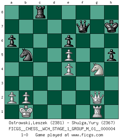 Last move : 1-0 2008 June 22 23:29:10 [Event "FICGS__CHESS__WCH_STAGE_1_GROUP_M_01__000004"] [Site "FICGS"] [Date "2008.01.08"] [Round "1"] [White "Ostrowski,Leszek"] [Black "Shulga,Yury"] [Result "1-0"] [WhiteElo "2381"] [BlackElo "2367"] 1.e4 c5 2.Nf3 d6 3.d4 cxd4 4.Nxd4 Nf6 5.Nc3 a6 6.Bg5 e5 7.Bxf6 Qxf6 8.Nd5 Qd8 9.Nf5 Nc6 10.c3 g6 11.Nfe3 Be6 12.h4 h5 13.Qb3 Rb8 14.Qa3 Be7 15.g3 Qa5 16.Qb3 b5 17.O-O-O O-O 18.Bh3 Qd8 19.Qa3 Qc8 20.Bxe6 fxe6 21.Nxe7+ Nxe7 22.Qxd6 Nc6 23.g4 b4 24.gxh5 Rd8 25.Qc5 bxc3 26.Rxd8+ Qxd8 27.Qxc3 Nd4 28.Kb1 Rc8 29.Qd3 gxh5 30.f4 Nb5 31.Rg1+ Kh7 32.Qe2 Qxh4 33.Qg2 Qf6 34.fxe5 Qf7 35.Ng4 1-0 Sicilian : Najdorf, 6.Bg5 Queenside Castling by player White (move 17) Kingside Castling by player Black (move 17) Player White won this chess game. Follow this game move after move (download)On the chessboard, lies and hypocrisy do not survive long. (Emanuel Lasker) Wer mein Gambit spielt, muß bereit sein, alle Brücken hinter sich abzubrechen. Es verändert den ganzen Menschen. Es wirkt wie ein Zauberstab und fördert verkümmerte, gute Charakter- eigenschaften wieder zu Tage. (Emil Joseph Diemer) El Ajedrez hace al hombre ser mas sabio y ver mas claro. (Vladimir Putin) Je crois qu'il existe des manières très spécifiques de jouer efficacement contre une machine. Evidemment, nous n'avons aucune chance en technique pure, parce que l'ordinateur calcule de manière parfaite. Mais lorsque nous faisons appel à notre cerveau, en utilisant l'intuition et la compréhension, alors nous restons beaucoup plus forts. (Anatoli Karpov) Statistics can be made to prove anything - even the truth. (Author unknown)